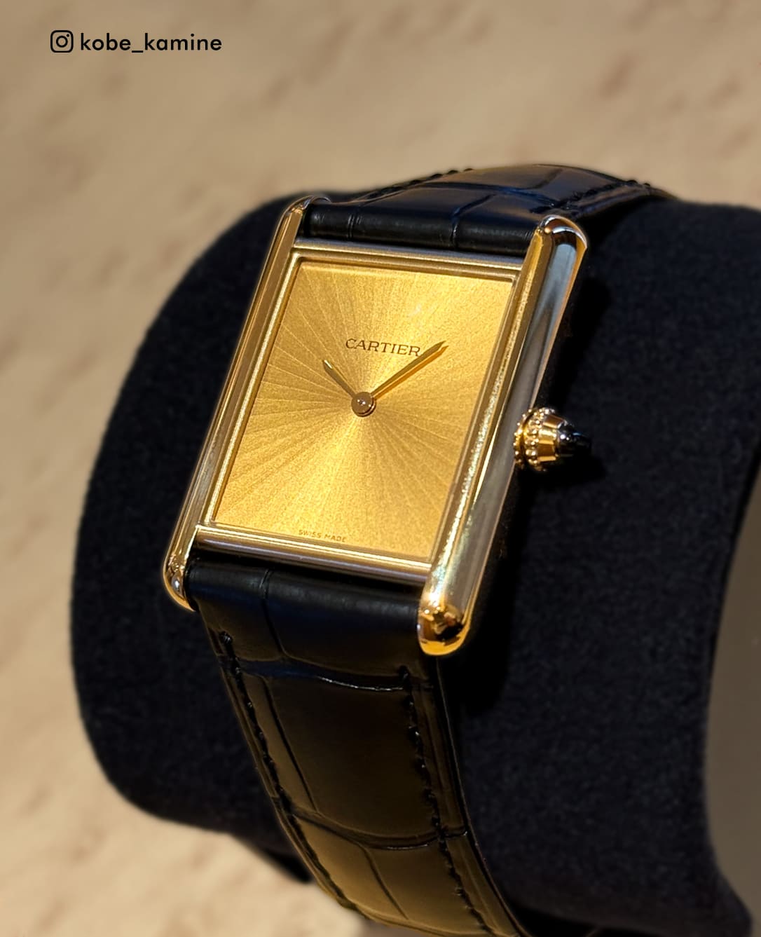 タンク ルイ カルティエ ウォッチ、ミディアムモデル、キャリバー 1917 MC 手巻きムーブメント。イエローゴールド750/1000製ケース。サイズ:33.7 x 25.5mm。厚さ:6.6mm。ゴールド サンレイエフェクト ダイアル。イエローゴールド750/1000製パール状の飾り付きリューズにサファイア。イエローゴールドフィニッシュ スティール製剣型針。セミマットブラック アリゲーターレザーストラップ。日常生活防水。