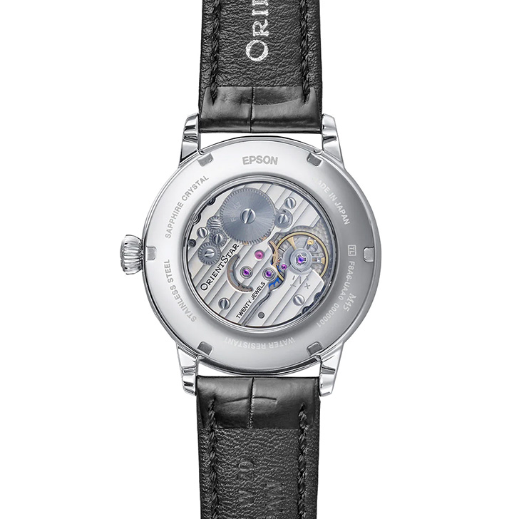 時刻表示においては時針と分針のみ、その他の機能はオリエントスターのアイコンであるパワーリザーブ表示と月齢表示というシンプルな構成です。