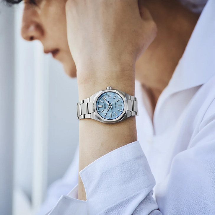 多面カットを施したインデックスと三面カットの時分針、爽やかでトレンド感のあるミントブルーダイヤルには緻密なクリスタルボックスパターンを採用することで、コンパクトサイズならではの高級感のあるデザインを実現。