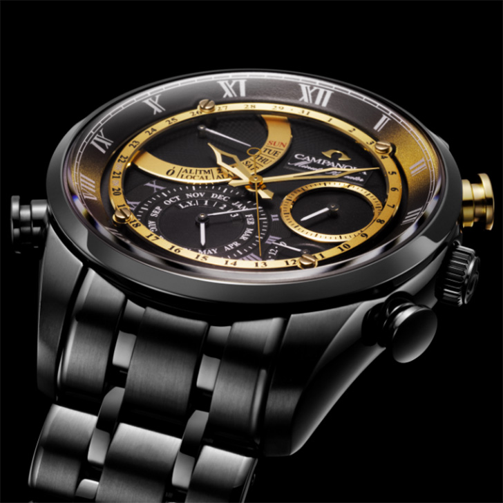 カンパノラでは初となるデュラテクトDLCを施したバンドを採用。ケースとバンドを艶やかなブラックに統一することで、宇宙の神秘的な美しさを表現しました。