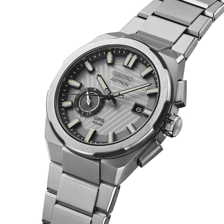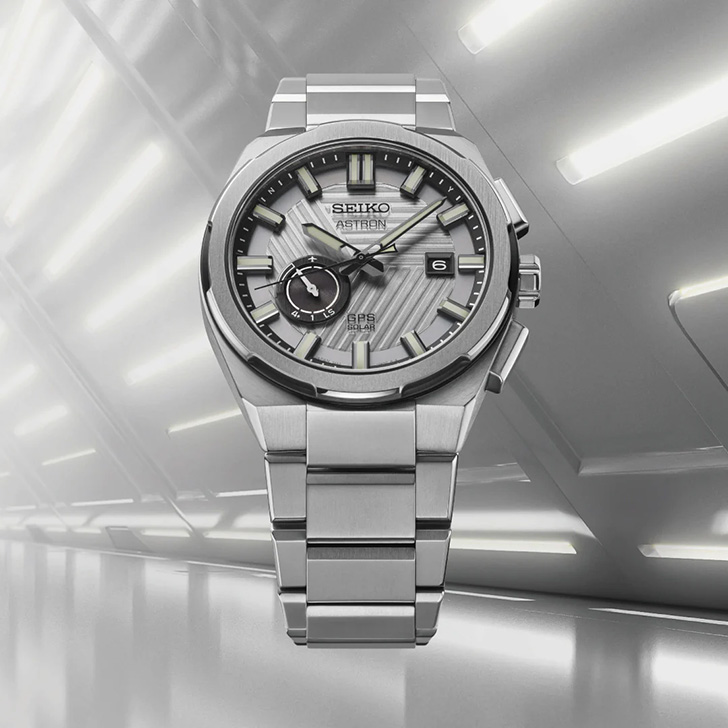 異なる金属を組み合わせた二層構造のベゼルが特徴です。エッジのきいたケース・ブレスレット・ダイヤルをシルバーカラーのワントーンで統一し、メタリックな宇宙船内の雰囲気を演出しています。