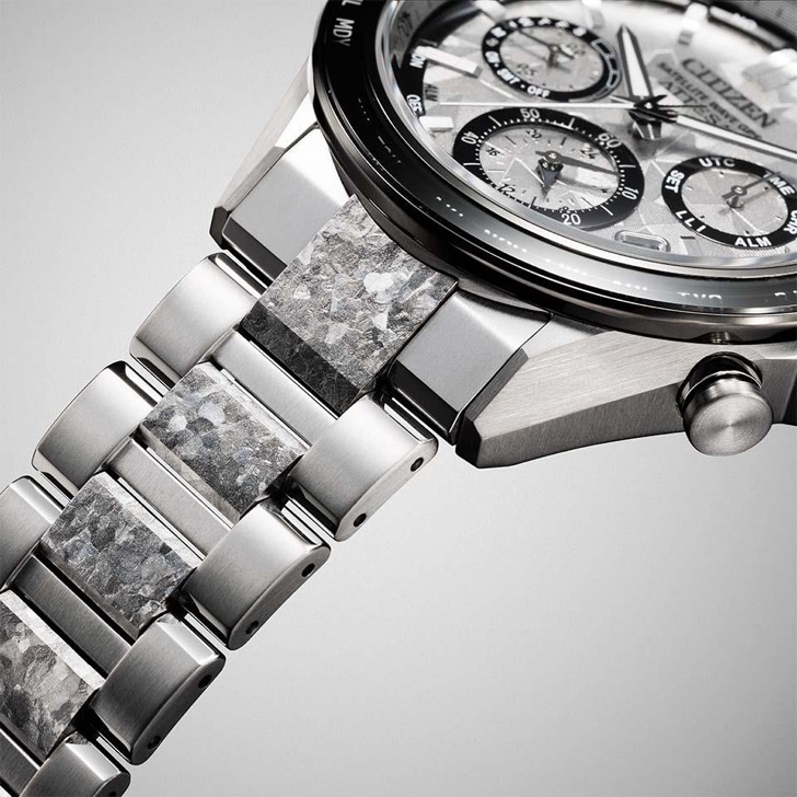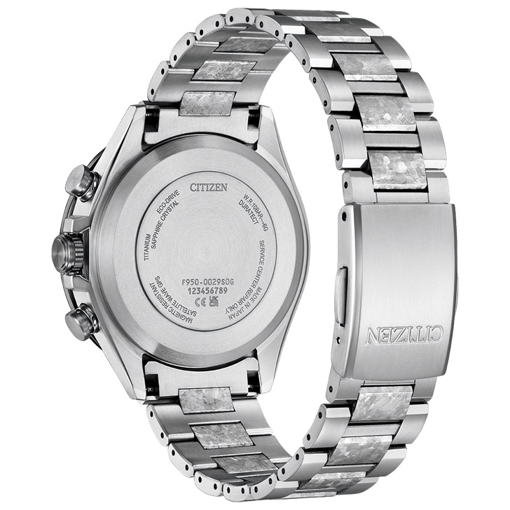 シチズン独自の技術で開発した結晶チタニウムを中駒に採用。デュラテクトプラチナを重ねることで結晶模様がプラチナの輝きをまとい、存在感を放ちます。