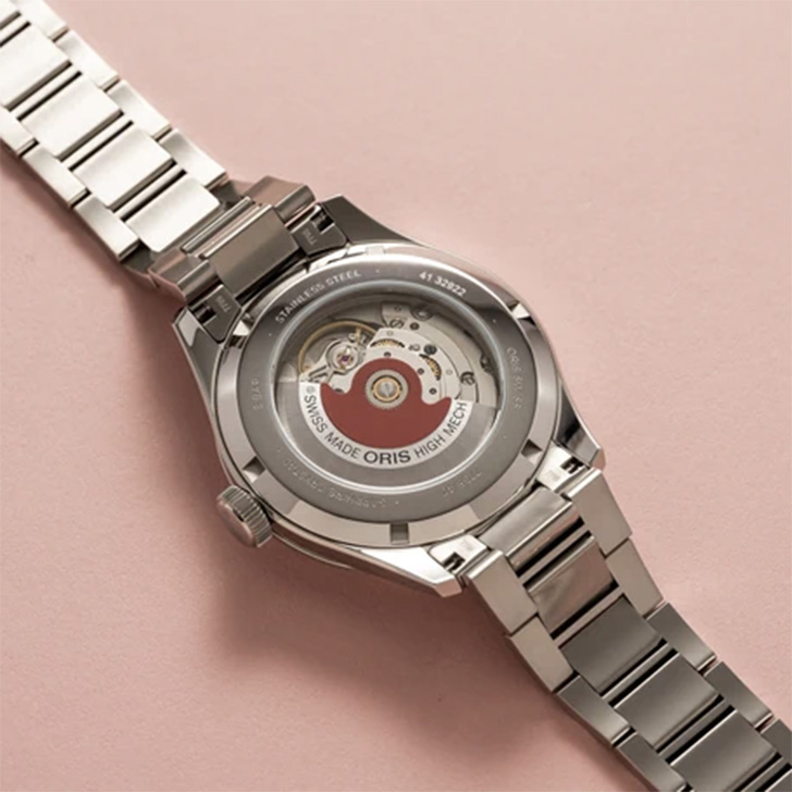 直径40mmの鮮やかなターコイズブルーが美しいダイヤル、ステンレススチールケース、Hリンクブレスレットを採用。Orisが独自開発したクラスプはまるでつけていることを忘れるような心地。