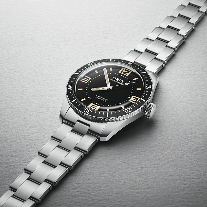 暗いところで光を放つ大胆なデザインの数字、ドーム型サファイアクリスタル、両回転ベゼルを配した、60周年を記念するアニバーサリーエディションです。オリスのロゴもレトロなデザインを復刻しました。