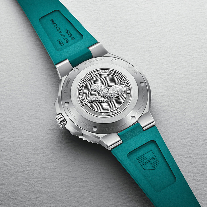 ニューヨークハーバー限定IIはBillion Oyster Projectのための特別なアクイスデイト。アクアグリーンの輝くシェル文字盤、30気圧防水、2,000本限定。