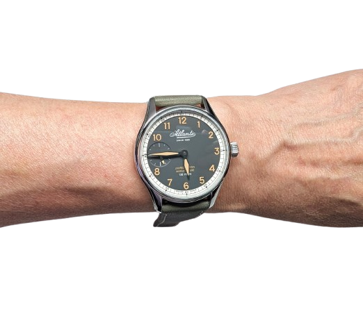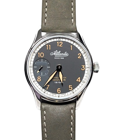 ダイヤル:ルミナス加工(夜光)の大きなアラビアインデックス、オリジナルのヴィンテージアトランティックロゴ、スモールセコンド