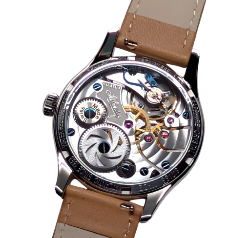 マニファクチュールムーブメント「自社製キャリバーATL-3」を搭載したこのタイムピースは53時間のパワーリザーブを備えた手巻きムーブメント。