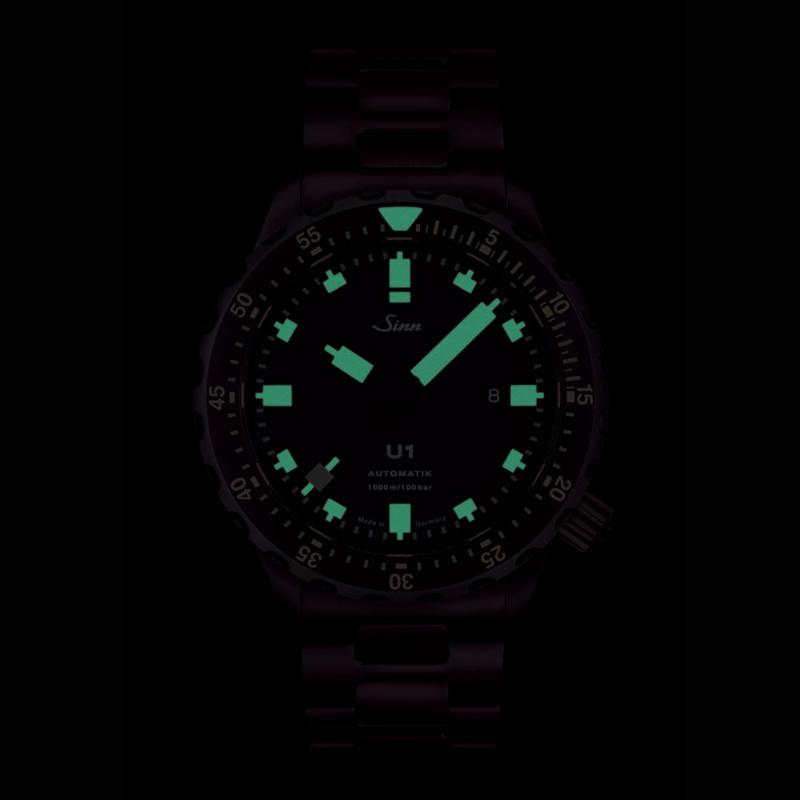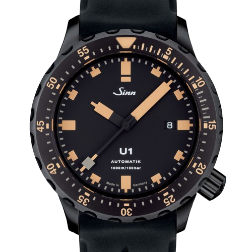 【Sinn】は特殊オイル66-228・Arドライテクノロジー・ハイドロシステム・マグネチックフィールドプロテクション・テギメント加工など、様々な技術を用い、視認性、機能性を最重要視したプロユースのドイツ製腕時計です。 【U1】はダイバーズウォッチの基本モデルです。時刻表示・日付表示・回転ベゼルの機能を有しています。防水は1,000mとプロフェッショナル仕様です。 【U1.S.E】は全体にブラックを採用しインデックスなどにはアイボリーをアクセントとして配色されています。ケース・リューズにはブラックハードコーティングを施しています。Uボートスチールにテギメント及びブラックPVDを行うと1500ビッカース(テギメントのみ1200ピッカーズ)という驚異的な硬度を実現させました。さらに特殊結合方式の逆回転防止ベゼルにもブラック・ハード・コーティングを実装しているので、衝撃に対して恐怖がなくなったといっても過言ではないです。 是非ご試着にご来店ください!