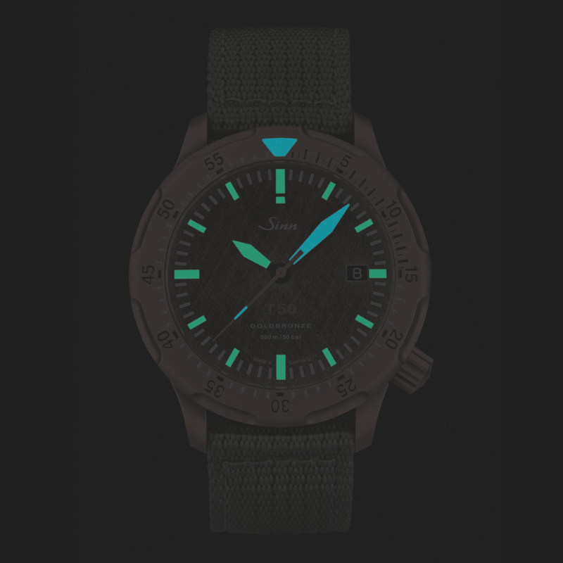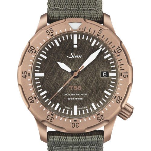 【Sinn】は特殊オイル66-228・Arドライテクノロジー・ハイドロシステム・マグネチックフィールドプロテクション・テギメント加工など、様々な技術を用い、視認性、機能性を最重要視したプロユースのドイツ製腕時計です。 【T50】は、特殊結合方式逆回転防止ベゼルで不意の衝撃でも外れることがないです。また誤操作防止に押して回さなければ回転しない構造を採用しています。夜光処理は色分けし暗所でも誤認しないように配慮しています(時針・ダイヤル・インデックス:グリーン、分針・秒針・ベゼルメインマーク:ブルー)。 【T50.GOLDBRONZE】は、特許申請中のブロンズ合金『ゴールドブロンズ125』(銅とスズにゴールドを12.5%混合させた合金)を採用しました。他金属を検出限界値まで排除し、海水に対する耐食性・素肌への適合性を高めました。酸化による変色・経年変化は起こりますが、一般的なブロンズに比べて表面の変色は緩やかです。付属の専用クロスで黒ずみを簡単に落とすことができます。ダイヤルにはSinnでもおなじみスクラッチ加工を施しました。世界で300本の限定生産ではありますが、同じものが二つとないまさに逸品です。 なくなり次第終了となります、ご検討はお早めに!