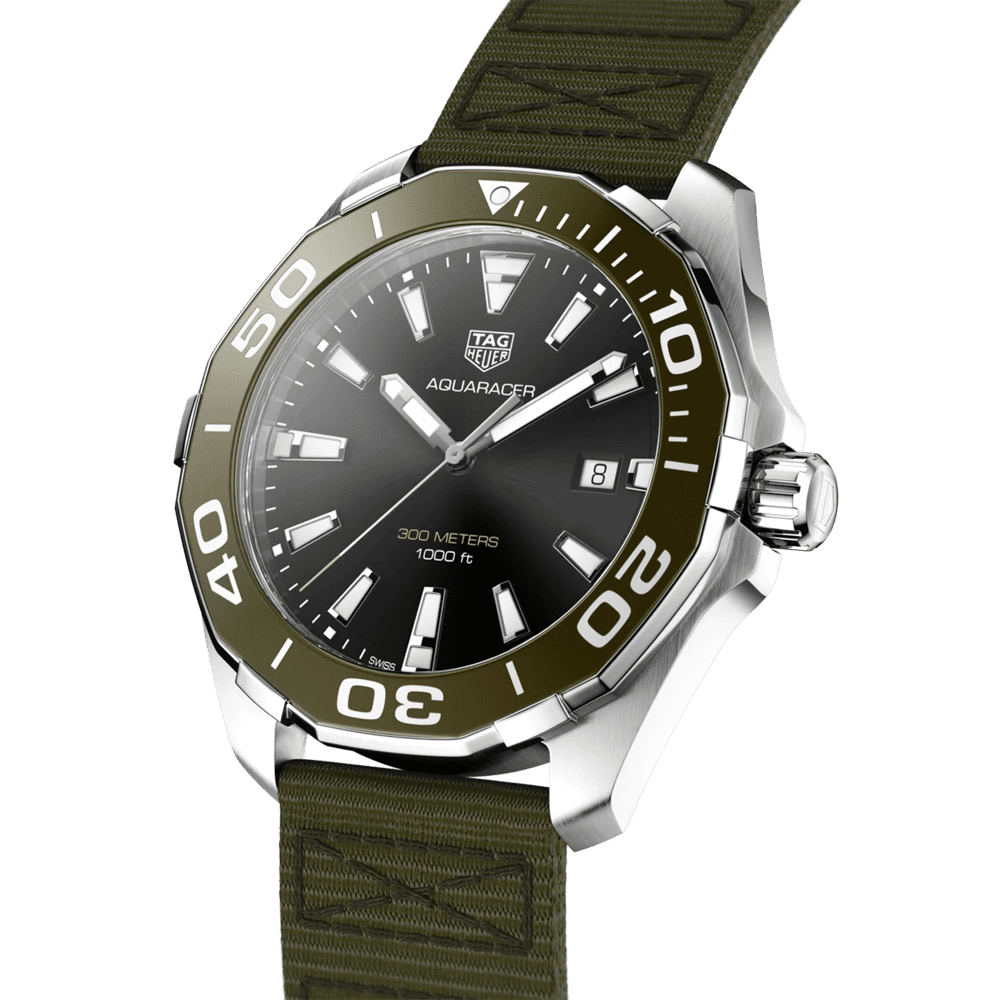 サンレイ加工サテン仕上げカーキ文字盤にマッチする、カーキのテキスタイルストラップを付属した43㎜クォーツダイバーズウォッチ。
