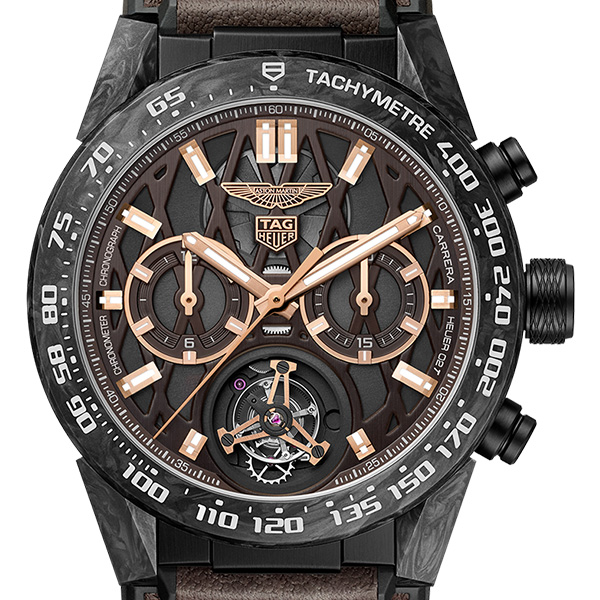 この45mm COSC認定トゥールビヨン クロノメーターは、ブラウンダイヤルにローズゴールドのアクセントを効かせた「アストンマーティン×タグ・ホイヤー カレラ」の限定モデルです。
