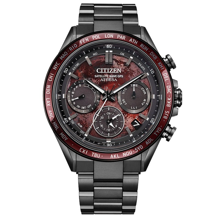 地球、太陽、月が一直線に並ぶ皆既月食をテーマに、特徴的な赤い文字板全体を月に見立てたデザイン。全面に配置したミステリアスな光を放つ白蝶貝文字板の上に、月の模様を描いたワインレッドの文字板を重ね、かつてない美しさを宿す“Blood Moon”を表現しました。サファイアガラスのベゼルは、裏側にダークレッドの蒸着、都市名にはシルバーの蒸着を採用。2回の蒸着で仕上げたベゼルが、深みのある大人の輝きを演出します。