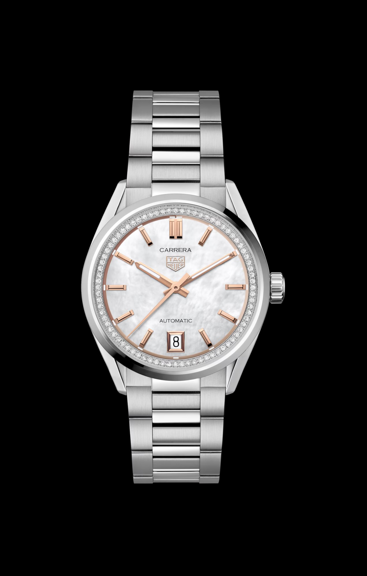 タグ・ホイヤー カレラ デイトが魅せる、タイムレスなエレガンスの世界へ。直径36mmのケースに、ホワイトマザー オブ パール のダイヤルと、76個のダイヤモンド(0.288ct) がセットされたフランジを合わせた壮麗なタイムピースが、アイコニックなカレラ コレクションにラグジュアリーなタッチを添えます。