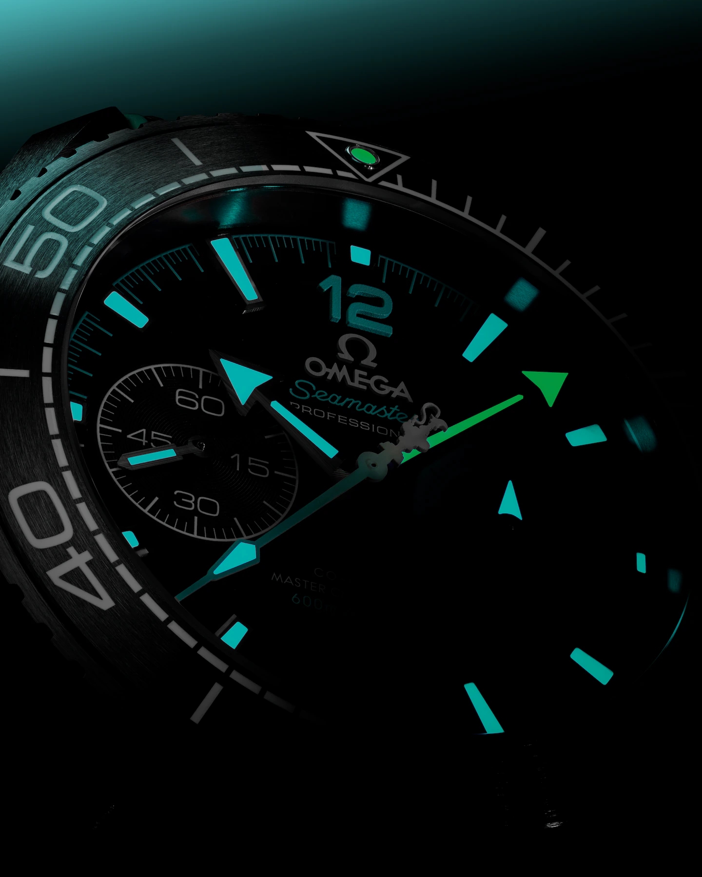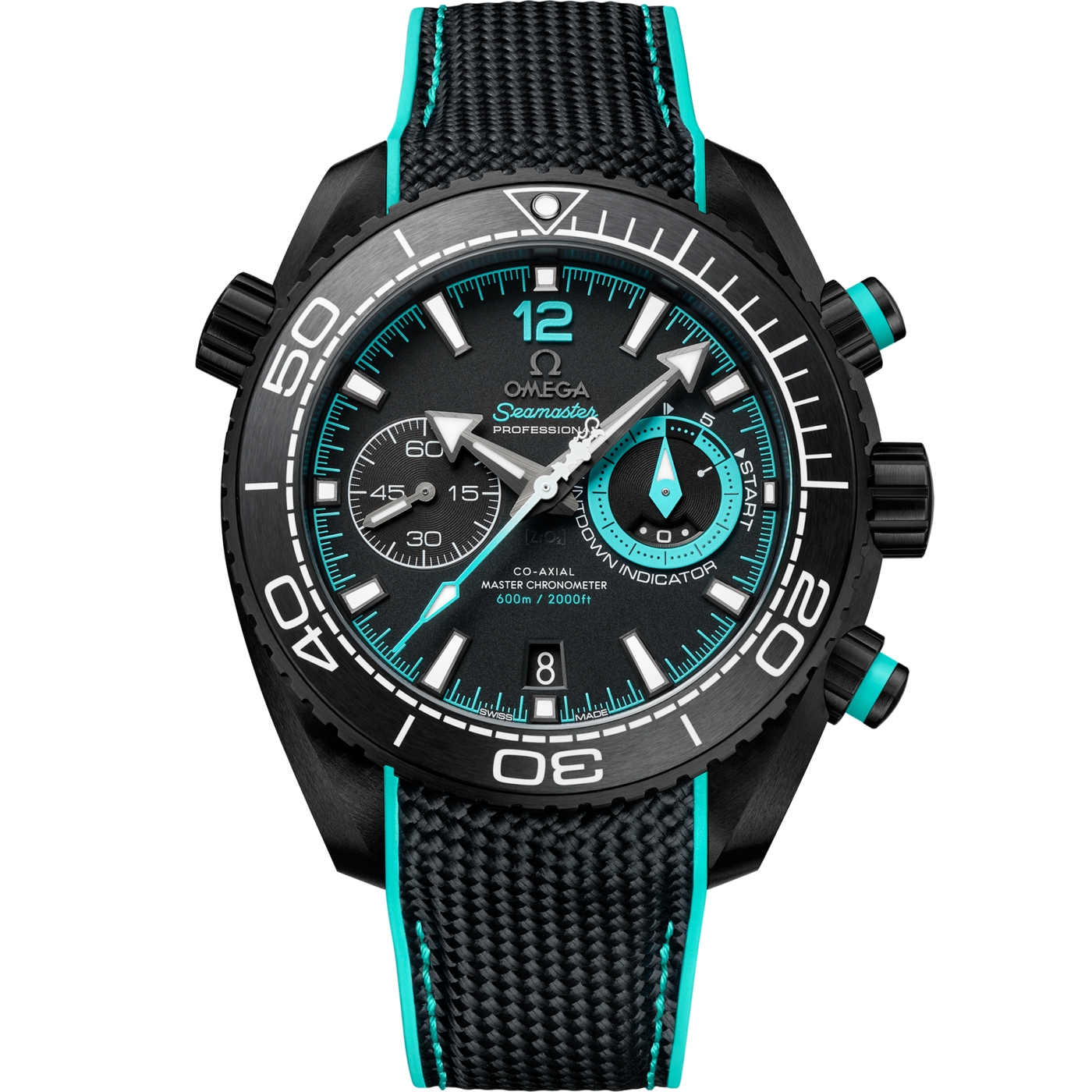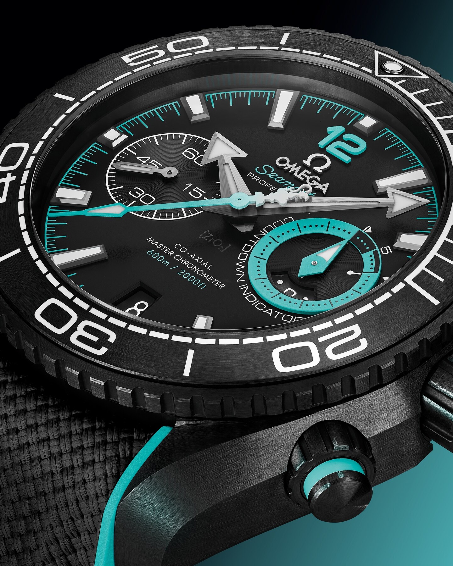 マットなセラミック製ダイアルの3時位置には、レースのスタートを計測するカウントダウン インジケーターが。レース前のプロトコルを思わせるデザインです。このインジケーターの針、そしてサブダイアルリング、ミニッツトラック、12の数字、アメリカズカップのトロフィーを象ったカウンターウェイト付きクロノグラフ秒針はすべて、ETNZロゴと同じターコイズカラーです。このカラーはまた、サテン仕上げのブラックセラミック製プッシュボタンに付いたリング、ヘリウムエスケープバルブに施された「HE」の文字、そしてリュウズにあしらわれたオメガのロゴにも使われています。
