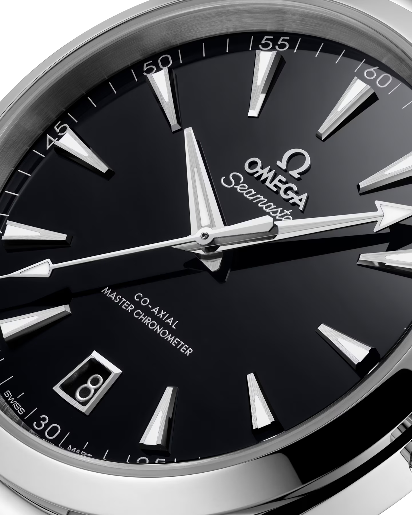 ブラックのニスを塗布し、ラッカー仕上げを施したダイアルには、ダイヤモンドでポリッシュしたロジウム仕上げのオメガロゴと、6時位置に日付窓を配しています。針とインデックスも同じくロジウム仕上げで、ブルーに発光するホワイトのスーパールミノヴァを塗布しています。