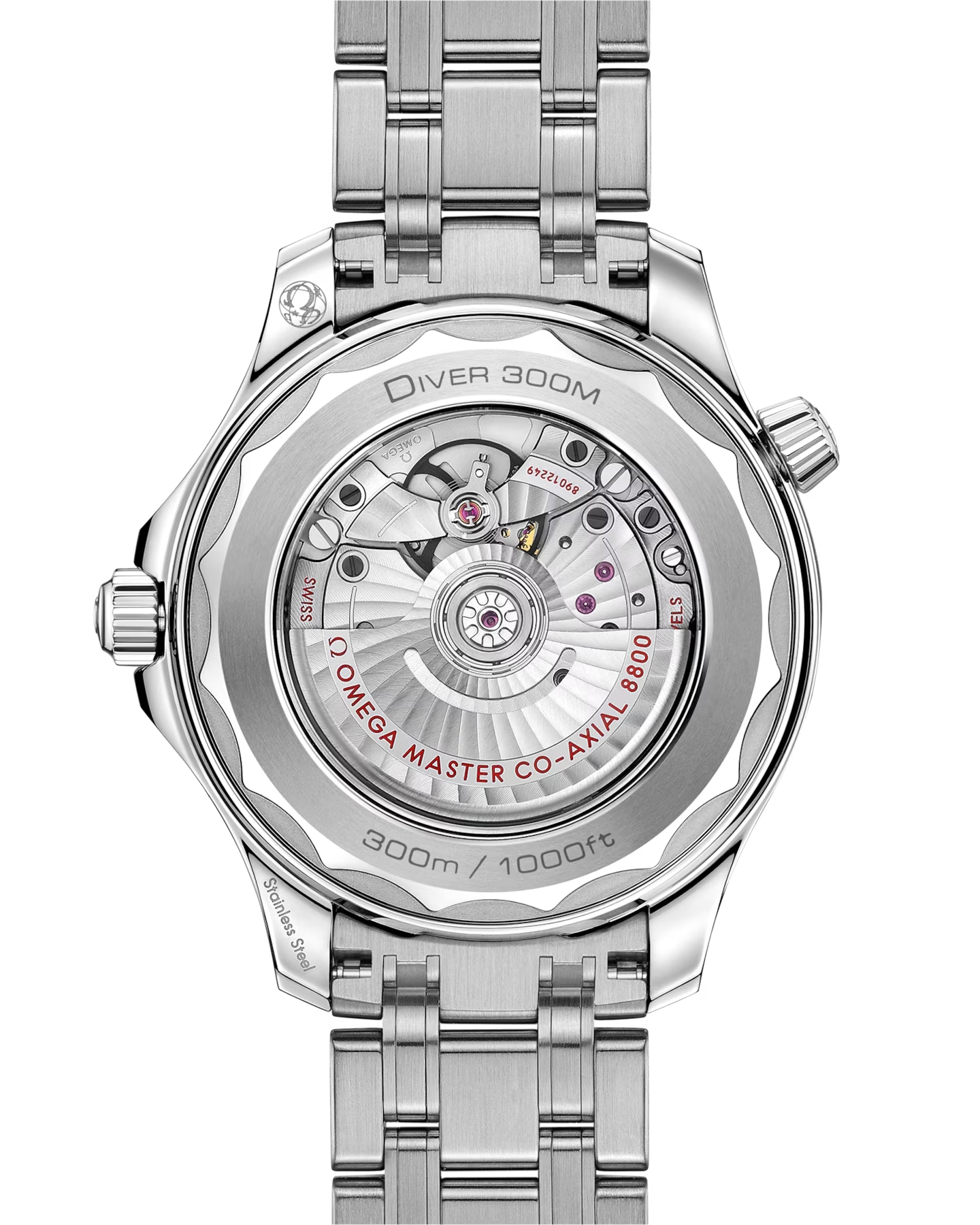 ブレスレットはステンレススティール製。オメガ マスター クロノメーター キャリバー 8800が搭載され、波模様で縁取られたサファイア・クリスタルのケースバックから眺めることができます。