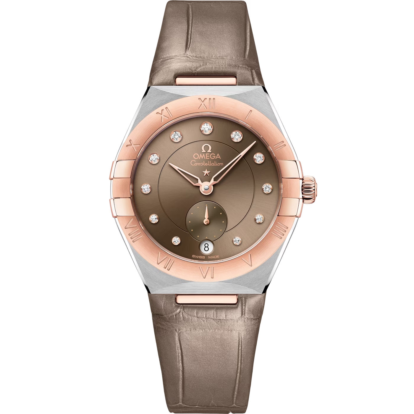 34mmの18Kセドナ™ ゴールド&ステンレススティール製モデルは、ベゼルにローマ数字を刻印。ライトチェスナッツカラーのダイアルには、6時位置にラウンドシェイプの日付窓が備えられています。12時方向に向かって徐々に大きくなるダイヤモンドのインデックスは18Kセドナ™ ゴールドのホルダーにセットされ、スモールセコンド サブダイアルと中央のミニッツトラックをリングが囲います。