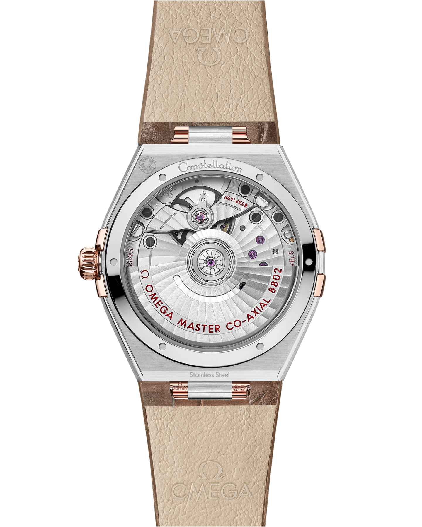 トープブラウンのレザーストラップが合わせられ、ムーブメントはオメガ コーアクシャル マスタークロノメーター キャリバー8802を搭載。傷がつきにくいドーム型のサファイアクリスタルから眺めることができます。