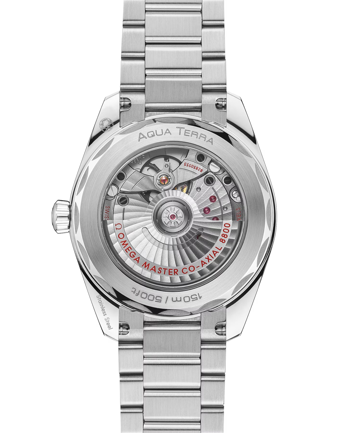 オメガと海の豊かな歴史にオマージュを捧げる「シーマスター アクアテラ」。シンメトリックな38 mmケースはステンレススティール製で、ポリッシュ仕上げのリュウズ、ケースバックにはウェーブ模様で縁取られたデザインが施されています。