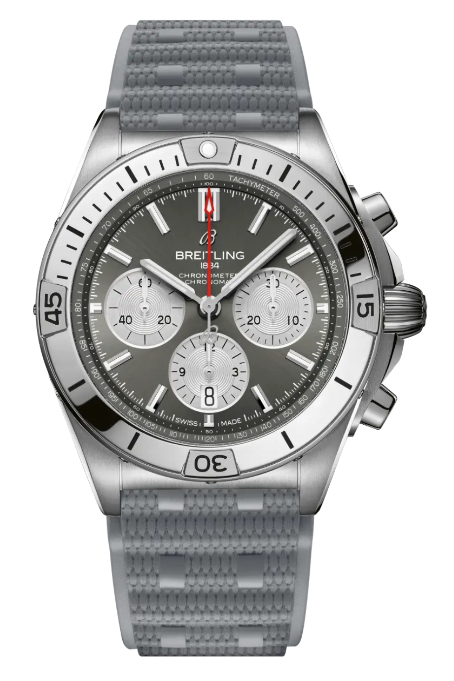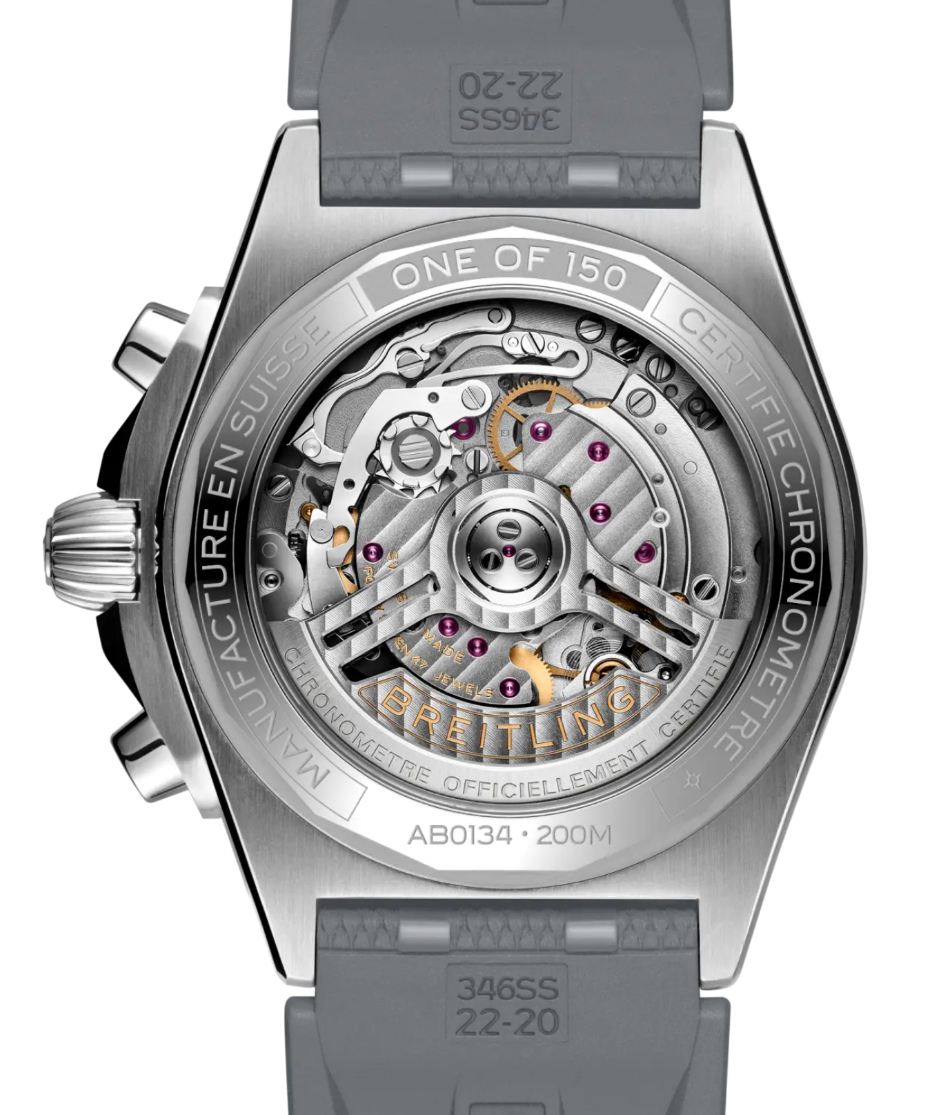 日本限定モデルは、かつてないアイシーなグレー文字盤と、同様にこのモデルで初めて採用されたグレーのラバーストラップによる絶妙なカラートーンが特徴。ひときわ際立つ赤いクロノグラフ秒針がスポーティさを加え、控えめな違いを好む方に最適な限定モデルです。ケースバックには限定生産本数を表すONE OF 150の刻印が。もちろんブライトリング・マニュファクチュールキャリバー01により駆動します。