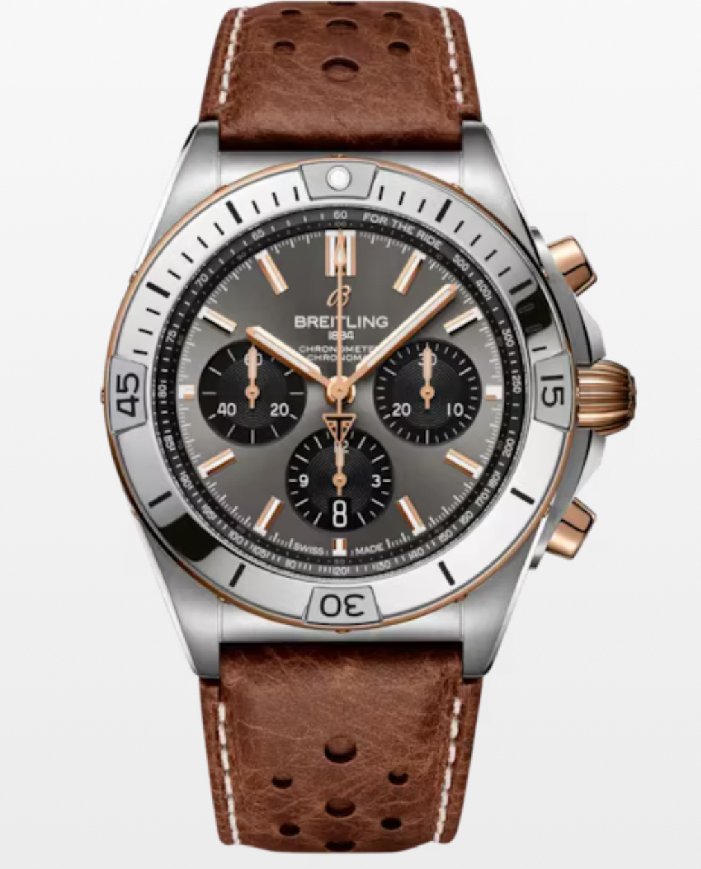 クロノマット B01 42 トライアンフは、チタンと18Kレッドゴールドのフレームを採用し、これまでで最高の仕様となっています。トライアンフとブライトリングが提携した限定オートバイ、スピードトリプル RRでも、この極上の品質を感じていただけるはずです。 中央のクロノグラフ針のカウンターウェイトには控えめなトライアンフのシールドロゴを配し、ケースバックには「Triumph Edition」の刻印。カーフスキンのレザーストラップにはパンチング加工を施し、オートバイと同じディテールを再現しています。