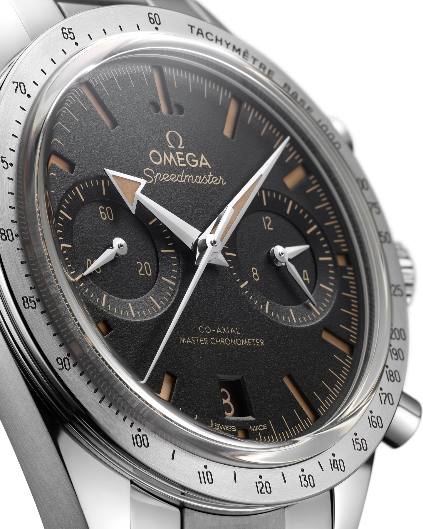 伝説的な1957年の初代スピードマスターにインスピレーションを受けた40.50mmのモデルは、ステンレススティール製ケースとブラックのダイアル、ヴィンテージ スーパールミノヴァが塗布された凹型のインデックスを備えています。ロジウム仕上げの「ブロードアロー」針、6時位置に日付表示、9時位置にスモールセコンド、3時位置には12時間と60分の同軸積算計のサブダイアルが配置されています。
