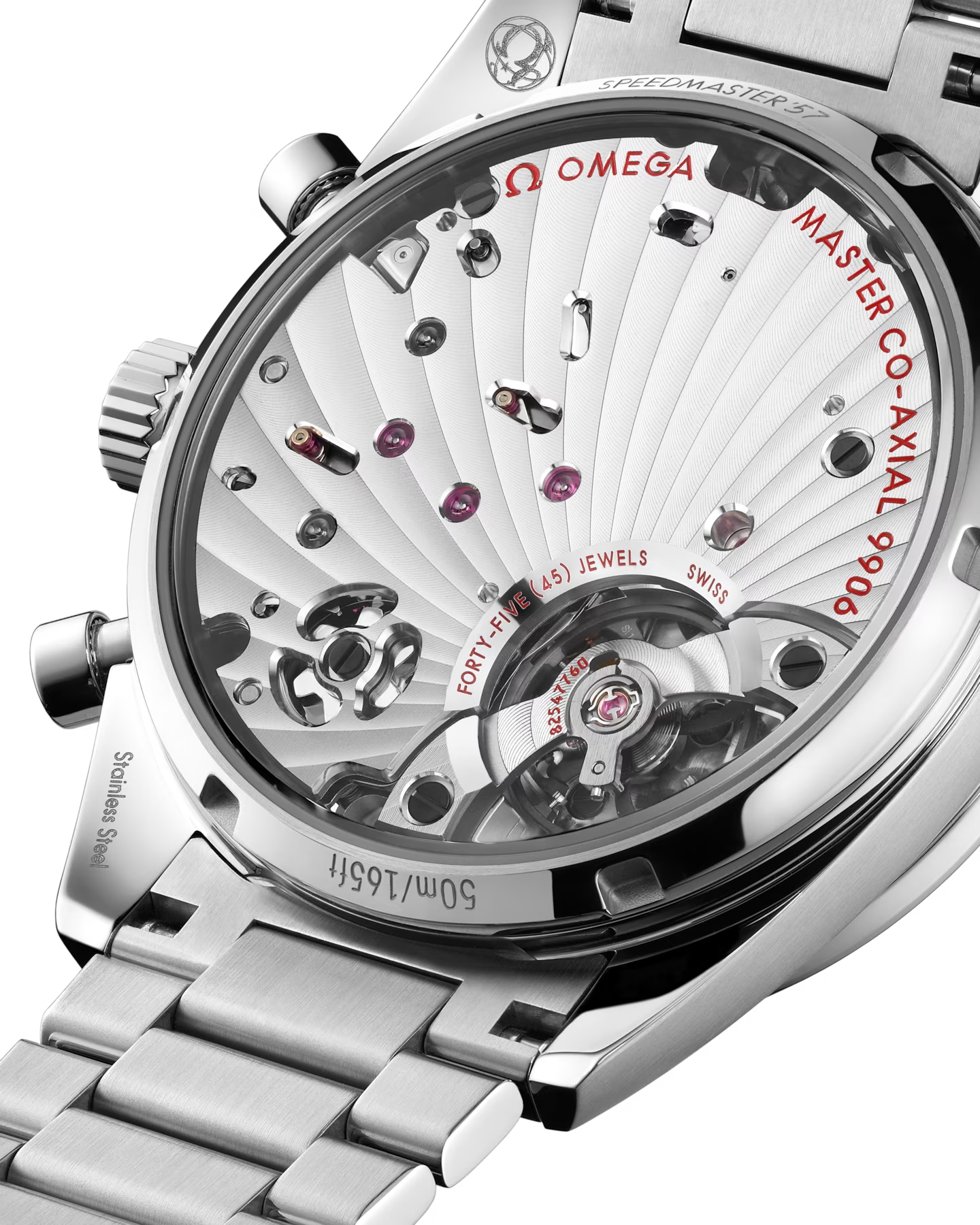 ブラッシュ仕上げのベゼルにはブラックのタキメータースケール、ケースバックには「Speedmaster ‘57」のエングレービングが施され、内側に無反射コーティングを施したフラットなサファイアクリスタルを備えています。