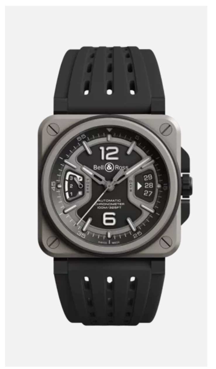 BR-X3 Titaniumは軽さと耐久性を極め、多層チタンケースのサンドイッチ構造により、高度な技術と快適さを両立させています。文字盤は印象的なX型デザイン。3時位置のデイト表示と9時位置のパワーリザーブはマットグレーで縁取られています。60分目盛り付きのフランジにセットしたメタルインデックスと蓄光針により、昼夜を問わず文字盤の視認性を実現しました。
