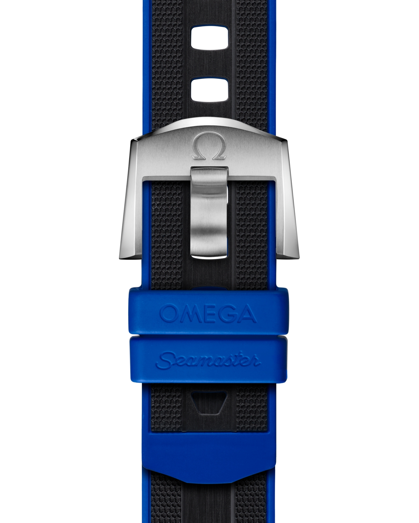 ラバーストラップにはブルーのライニングとO-MEGASTEEL製バックルが備えられ、ケースバックのグレード5チタン製メダリオンには、オメガを象徴する中央のシーホースと共に、ソナーエンブレムがエングレービングで刻印されています。搭載されているムーブメントは、オメガ コーアクシャル マスター クロノメーター キャリバー8912です。