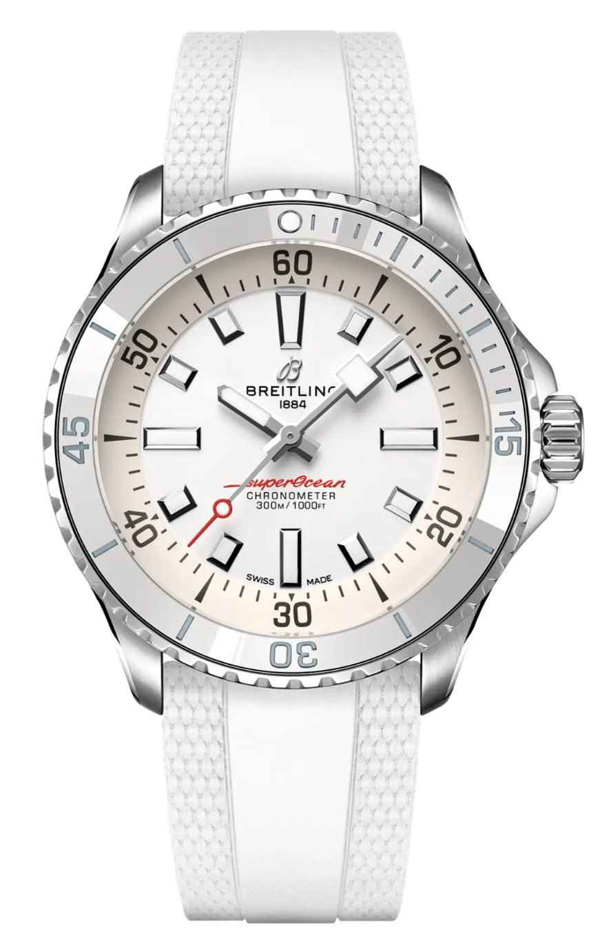 新しいスーパーオーシャンは、人気の高かったスローモーションのデザインコードを踏襲しながらも、セラミックインレイベゼルや鮮やかな色のダイヤルなど現代的な特徴を加味しています。幅広の針とインデックスには蓄光塗料スーパールミノバ®が塗布され、水中でも読み取りやすくなっています。ウォッチの防水性は300m、さらに衝撃、砂、塩水に対する耐性も有ります。ストラップはホワイトのラバーをご用意。フォールディングクラスプにより最大15mmの微調整が可能で、ラッシュガードやウェットスーツの上からでも簡単に装着することができます。傷が付きにくいセラミックインレイベゼルは、摩耗や色落ちがありません。安全のため、ベゼルは逆回転防止付きです。 そして何より、この時計はもはや単なるダイバーズウォッチではありません。サーフィン、水泳、ビーチバーやディナーといったシーンでも最適です。この日本限定モデルであるスーパーオーシャンは、全てが白で統一されたスッキリ洗練されたアクティブなスタイルが特徴のモデルで、伝統に対するノスタルジーと新鮮なスタイルを完璧に調和させています。