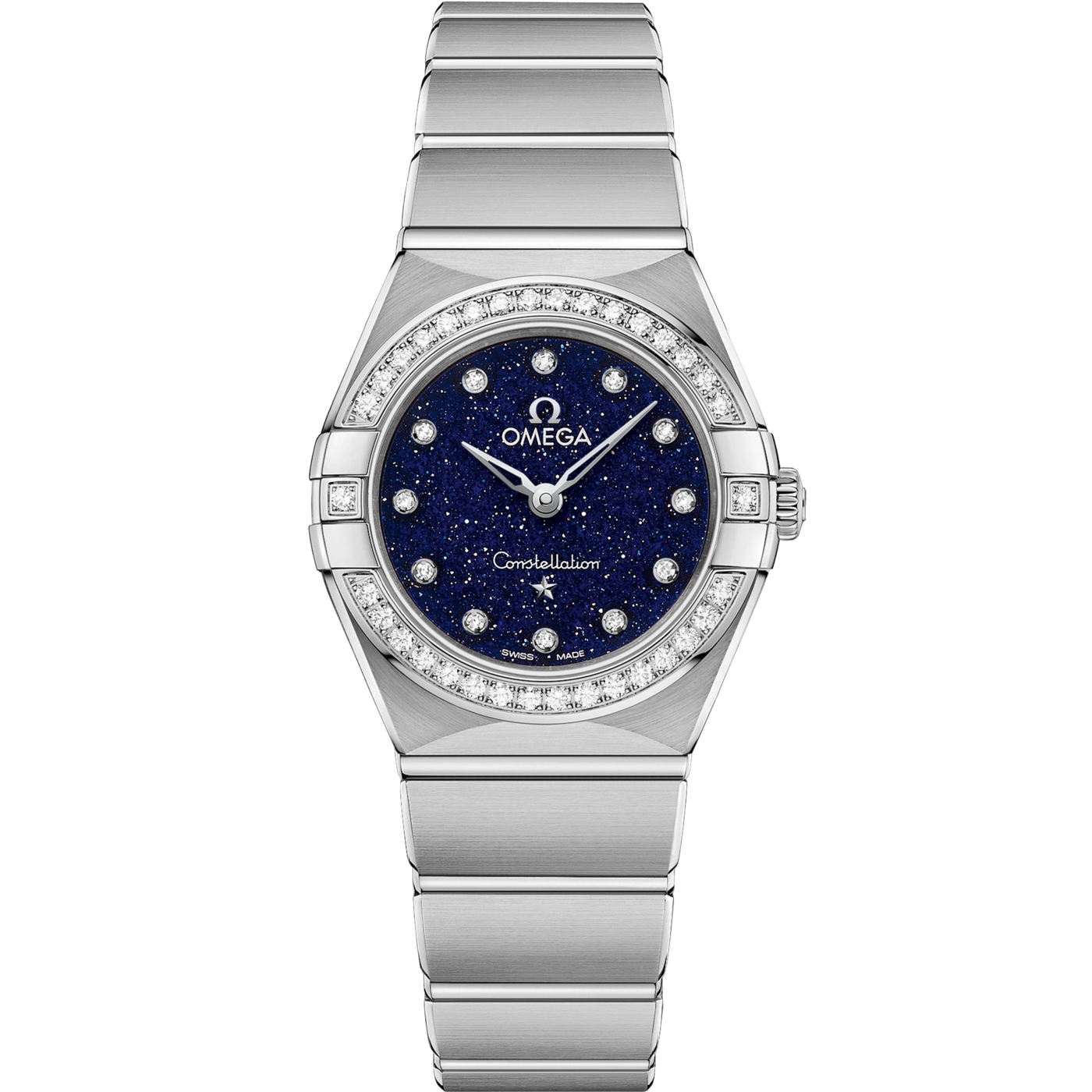 この直径25㎜のステンレススティール製モデルは、ダイヤモンドに彩られたベゼルが印象的で、ブルーアベンチュリンガラス製のダイアルには、ダイヤモンドのインデックスが配されています。針、オメガロゴ、コンステレーションの「星」、ダイヤモンドインデックスのベゼルには18Kホワイトゴールドが使用されています。