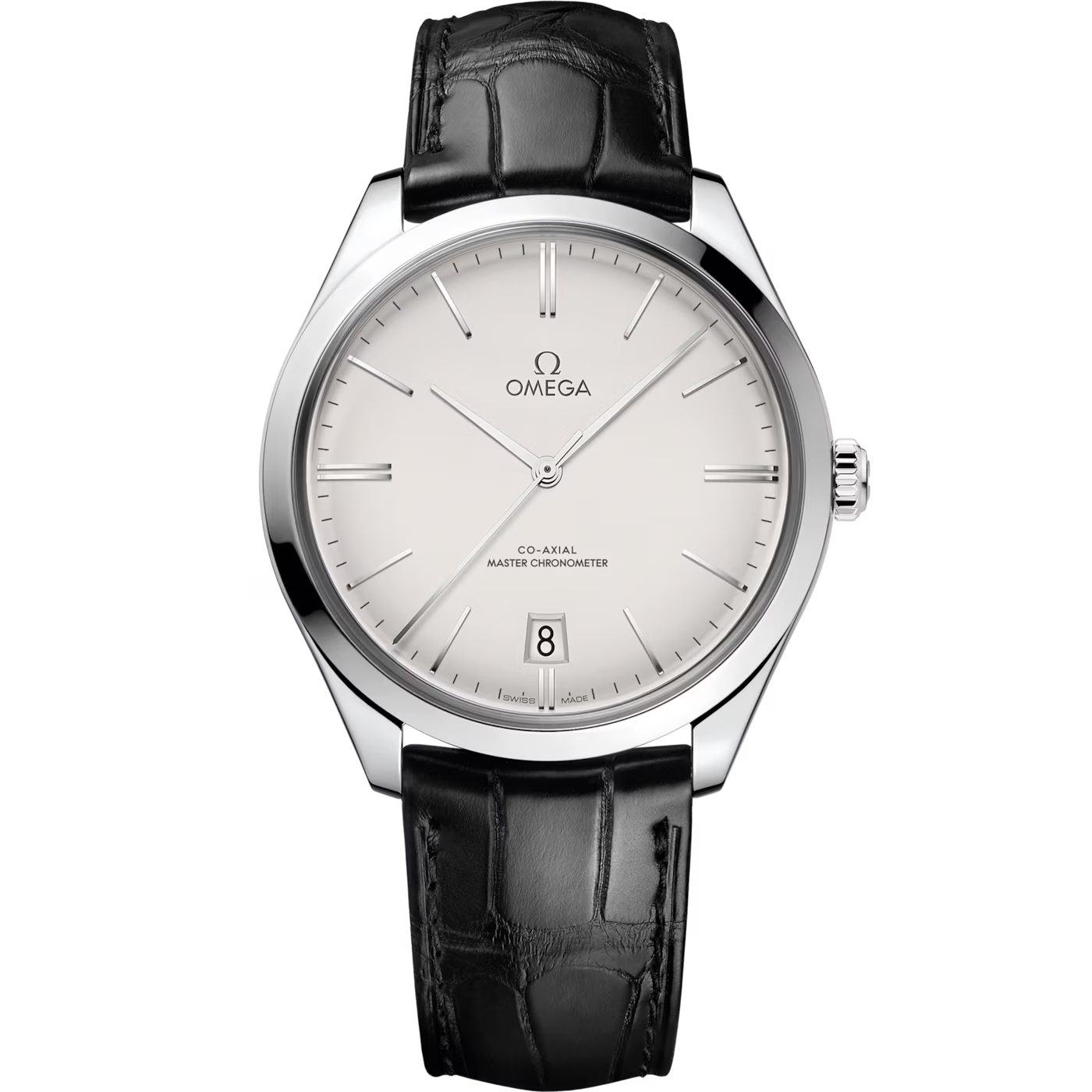 この40 mmのステンレスステ⁠ィ⁠ール製ケ⁠ースには⁠、ブラ⁠ックレザ⁠ーストラ⁠ップが付属⁠。ド⁠ーム型のオパリンシルバ⁠ーのダイアルには⁠、6時位置の日付表示や⁠、18Kホ⁠ワイトゴ⁠ールドの針とインデ⁠ックスが配されています⁠。