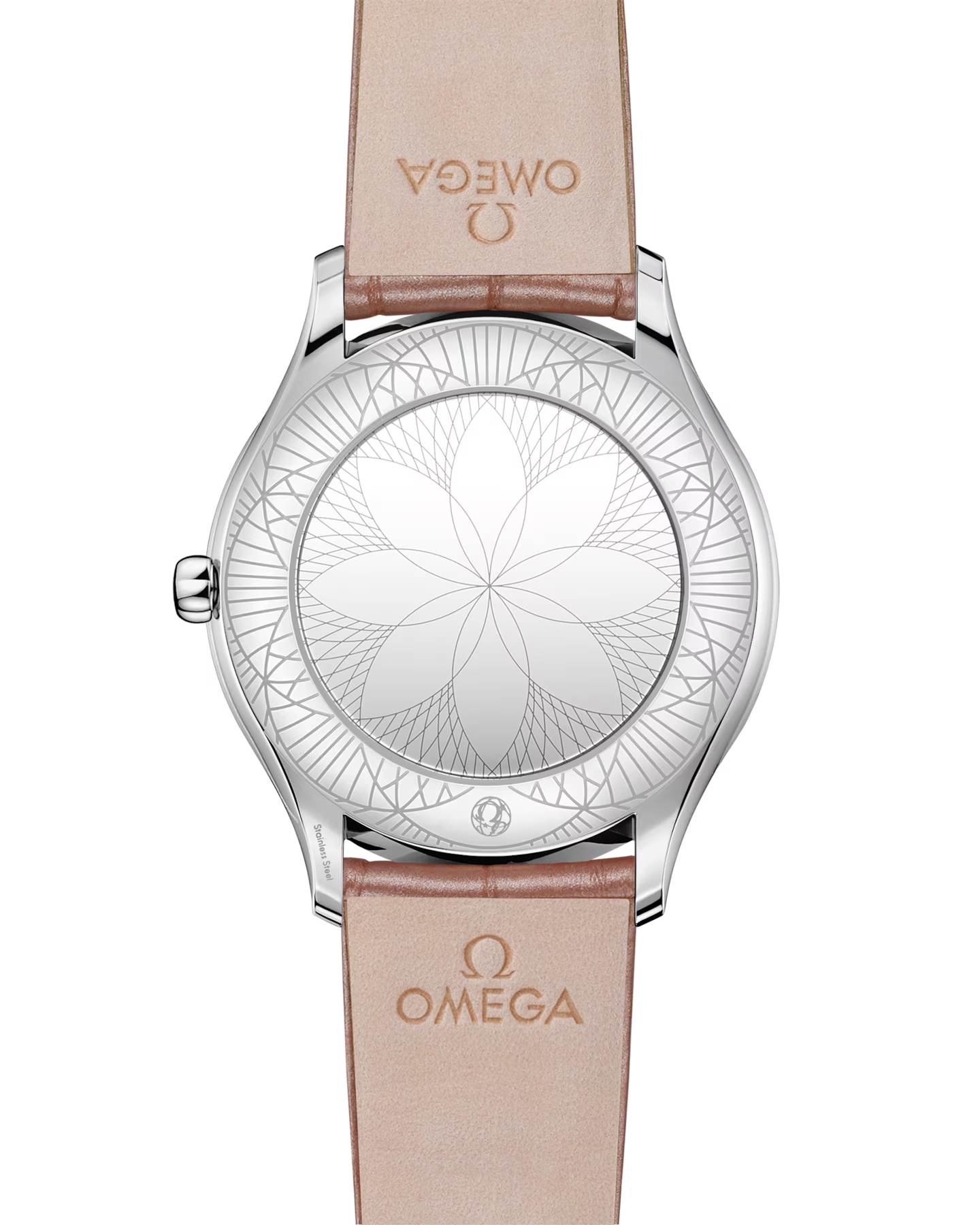 オメガ キャリバー4061搭載。特殊な鏡面仕上げのケースバックには、オメガのレディスウォッチの歴史を紹介する「Her Time」エキシビションのシンボルとして使われているフラワーパターンがあしらわれています。「トレゾア」バックル付きの、ヌードカラーのレザーストラップが付属しています。