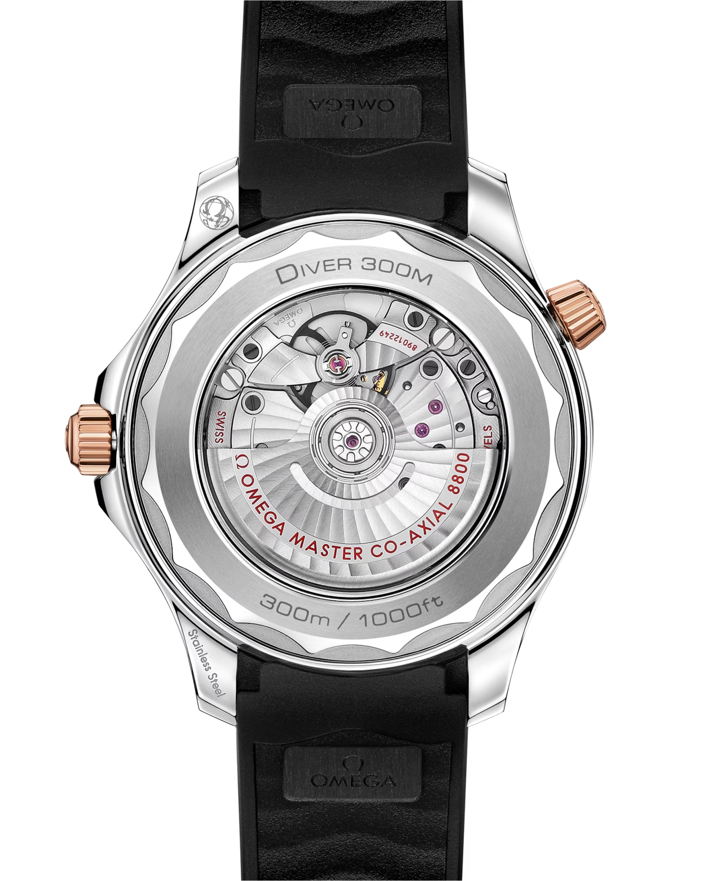 ブラックラバー製のストラップが付属。オメガ マスター クロノメーター キャリバー 8800が搭載され、波模様で縁取られたサファイア・クリスタルのケースバックから眺めることができます。