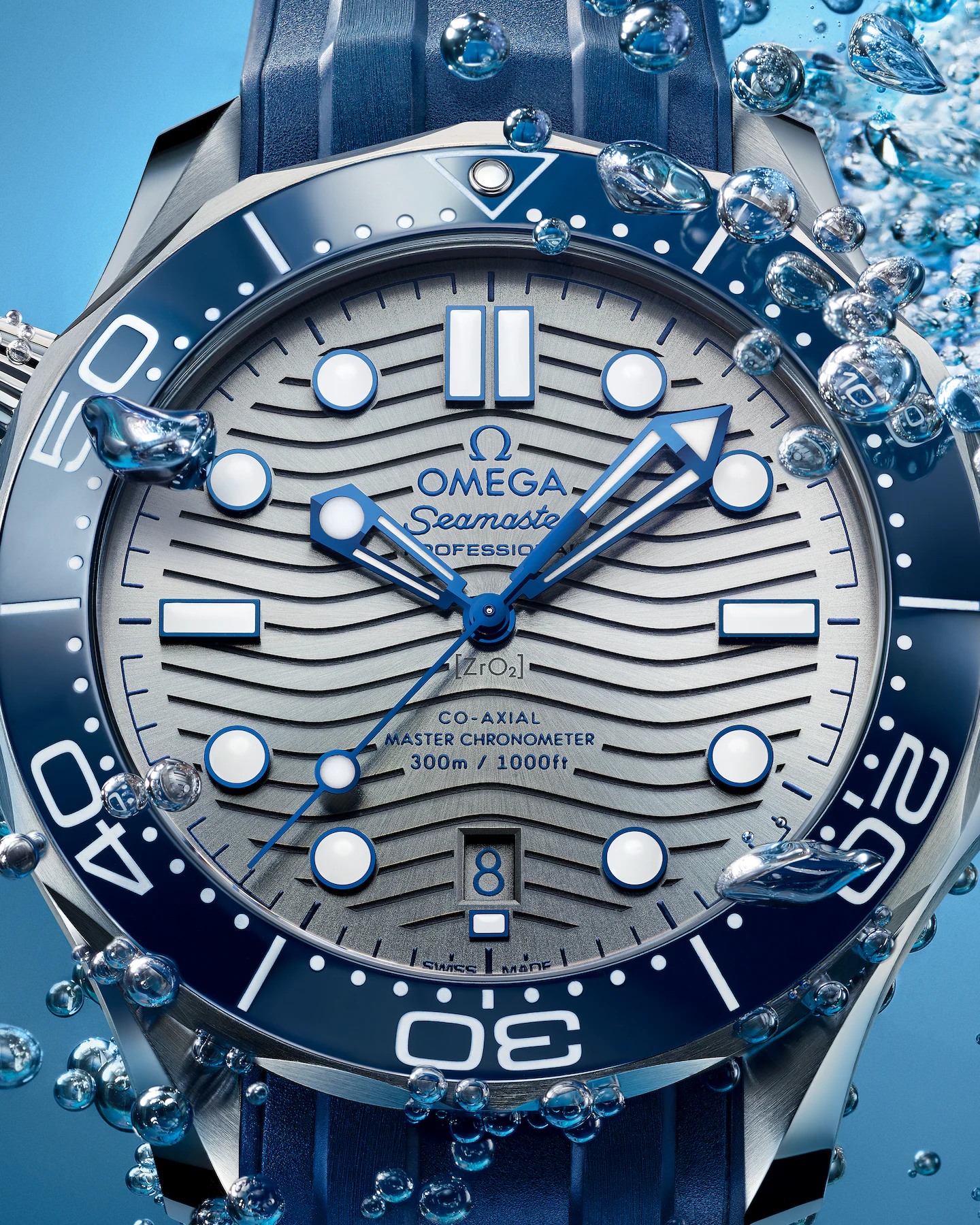 ブルーラバー製のストラップが付属。オメガ マスター クロノメーター キャリバー 8800が搭載され、波模様で縁取られたサファイア・クリスタルのケースバックから眺めることができます。
