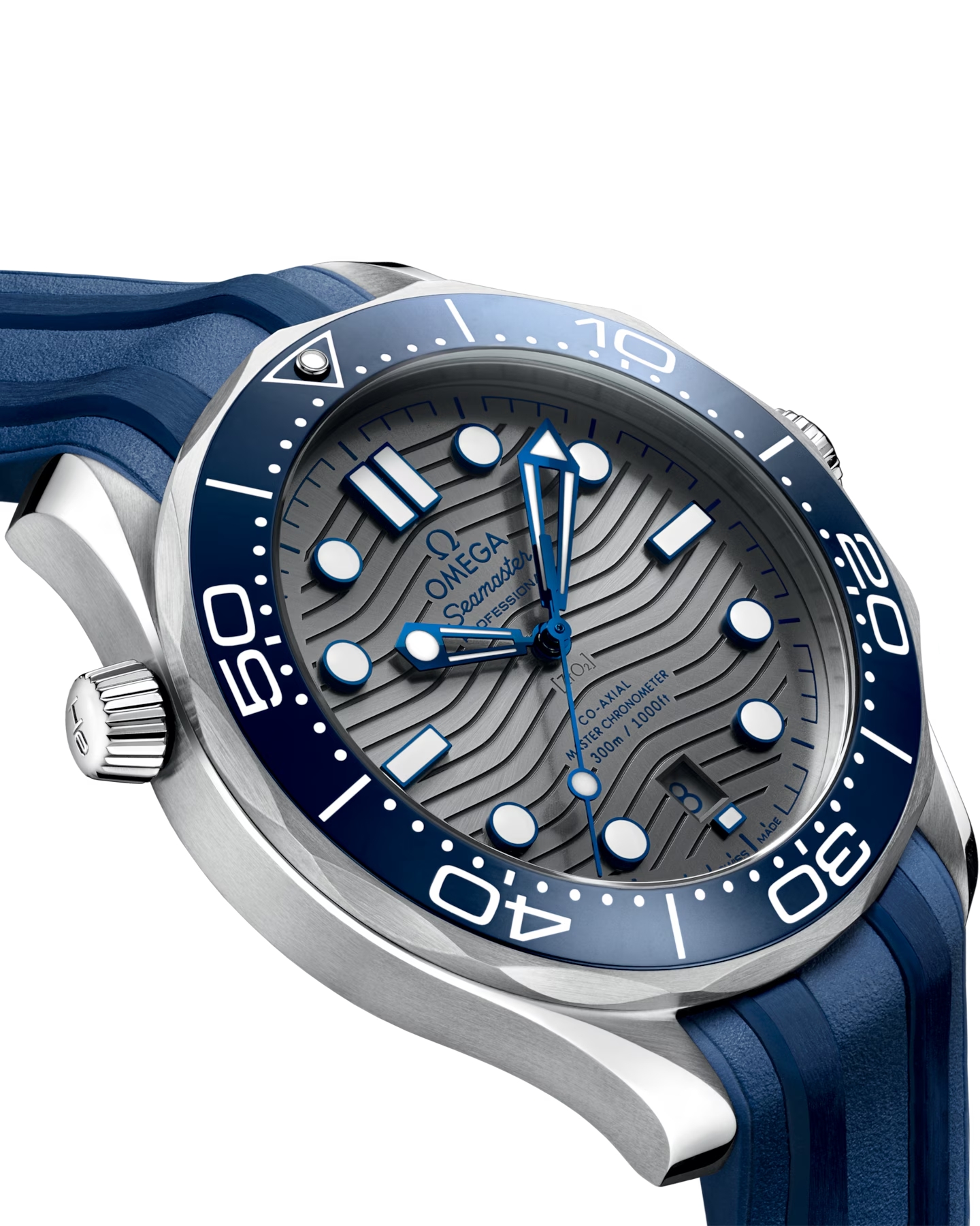 この42mmモデルは、ステンレススティール製で、ブルーセラミック製ベゼルにはホワイトエナメルのダイビングスケールが付属しています。ダイアルはサンブラッシュ仕上げPVDクロームカラー セラミック製で、レーザーエングレービングによる波模様と6時位置の日付表示が特徴です。