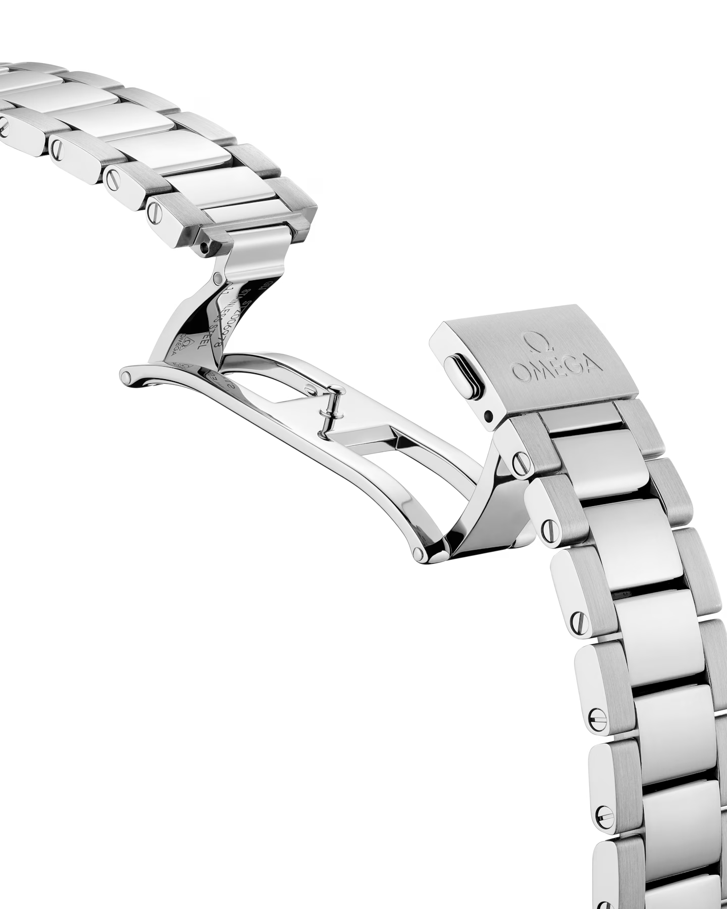 ブレスレットは、ポリッシュおよびサテン仕上げ。「スイス連邦計量・認定局(METAS)認定の最高水準を誇るオメガ コーアクシャル マスター クロノメーター キャリバー8800搭載。