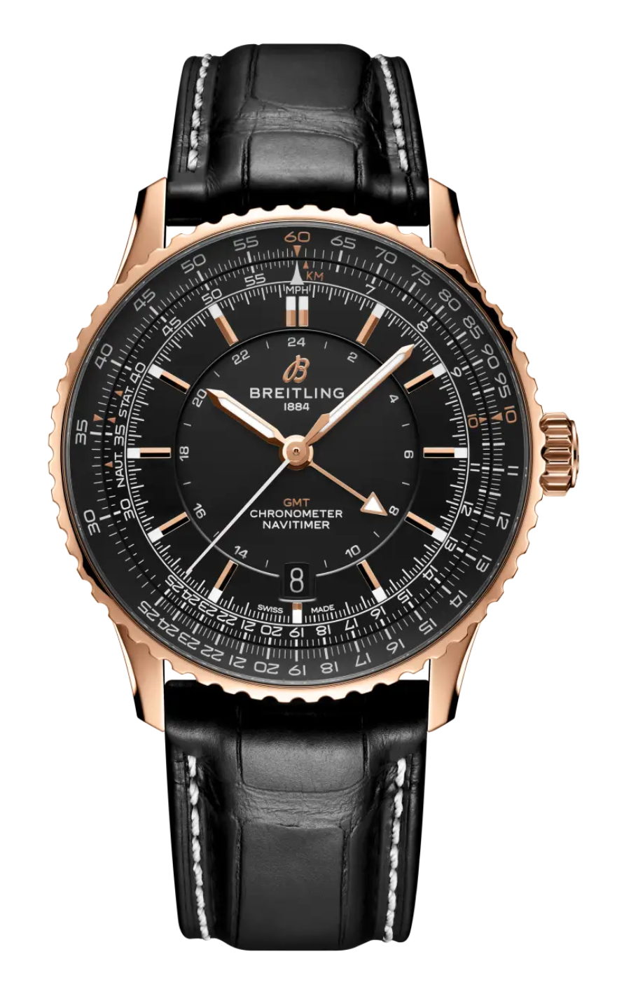 ナビタイマー オートマチック GMT 41 は、アイコニックな外観を取り入れながらクロノグラフを省き、バランスの取れたダイヤル構成になっています。GMTは24時間目盛りを中央に配置し、オートマチックではすっきりとしたフェイスを採用することで、複雑な計算尺を際立たせながら、全体的な美しさを引き締めています。このコレクションにさらに磨きをかけるために、ブライトリングは現代的な刻み入りベゼルを採用。ポリッシュとサテン仕上げを交互に取り入れることで生き生きとした光の演出を感じられる仕上がりになりました。クラシックとコンテンポラリーを融合させた最新のナビタイマーは、ブライトリング・ファンと自分自身のスタイルを大切にする全ての人々に向けたもので、いつの時代も伝統と革新に挑み続けるブライトリングの思いが込められています。 日本市場に向けて特別に製造されるナビタイマー オートマチック GMT 41 ジャパン リミテッドは、通常はグリーンモデルしか展開のない18Kレッドゴールドケースのモデルに、ブラックの文字盤を与えた特別仕様。インダイヤルのないGMTモデルならではのワントーンで整った文字盤により、確かな個性を抑制的に見せることに成功しています。ケースバックには「ONE OF 50」の刻印が施される、日本限定50本のモデルです。