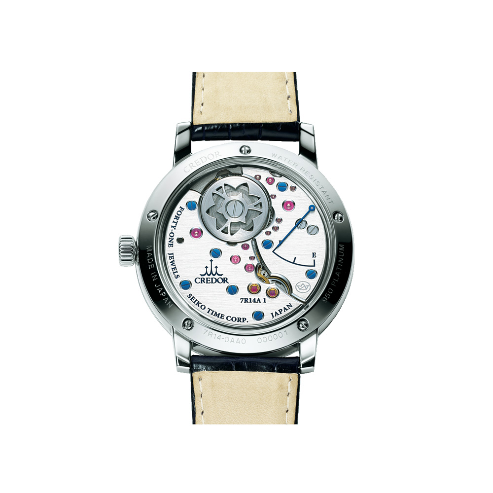 ムーブメントは、2枚構成にした「受け」部品にパワーリザーブ表示をバランスよく配置し、シンプルながらもダイナミックに仕上げています。また、「受け」の輪郭、ルビーやねじ穴周りの面取り部は、職人の手作業によりどの角度からも美しく輝くよう、曲面形状に鏡面仕上げされています。その「受け」全面に筋目仕上げを施す対比により、磨き上げた鏡面部とテンパーブルーのねじが映え、研ぎ澄まされた美しさを表現しています。