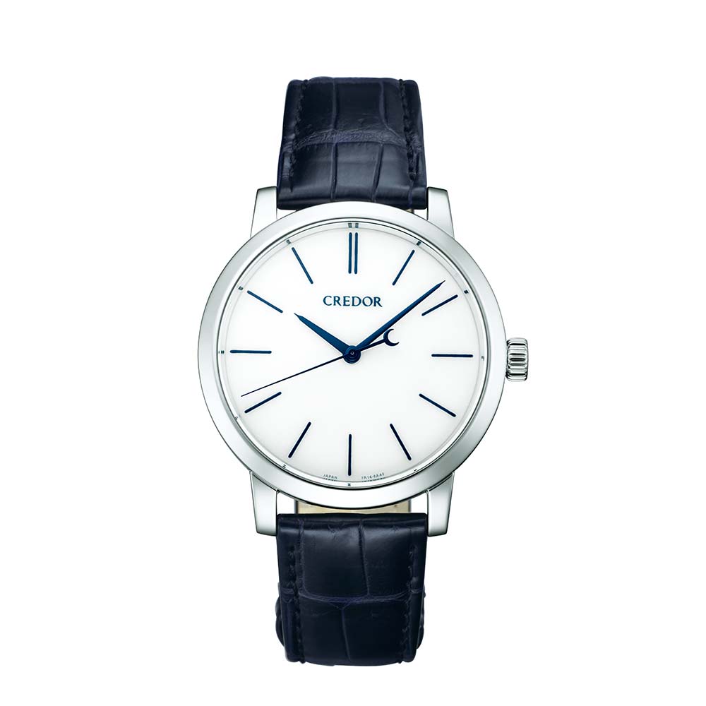 信州に降り積もる雪をイメージした純白の磁器製のダイヤルに、マイクロアーティスト工房の卓越した職人が12箇所のアワーマークとクレドールロゴを一点一点手描きしています。