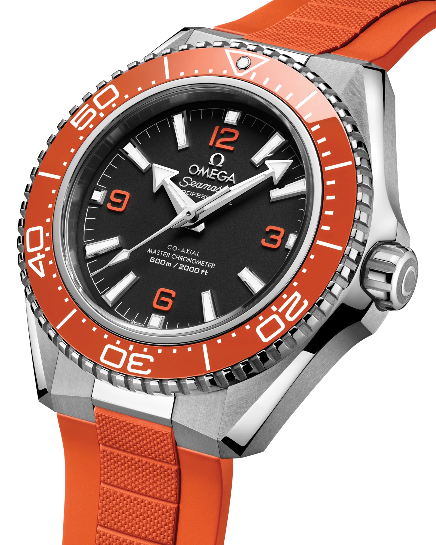 コーアクシャル マスター クロノメーター キャリバー8912搭載。ステンレススティール製のコマがケースと繋ぐ、フォールディングクラスプ付きのオレンジラバーストラップが合わせられています。時計を裏返すと、ポリッシュ&ブラッシュ仕上げのグレード5チタン製ねじ込み式ケースバックに、オメガの有名なシーホースのエンブレムを見ることができます。