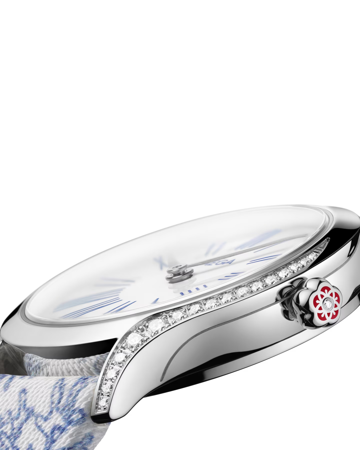 ステンレススティールのこのモデルは、26mmのケースの両サイドにダイヤモンドがエレガントな曲線を描くように敷き詰められています。リュウズにはリキッドセラミック製の赤いフラワーモチーフがあしらわれ、一粒のダイヤモンドがセットされています。オフホワイトの「グラン・フー」エナメルで作られたドーム型のダイアルには、ダイヤモンドポリッシュ仕上げのロジウムプレートの針と転写されたブルーのローマ数字のインデックスが配されています。
