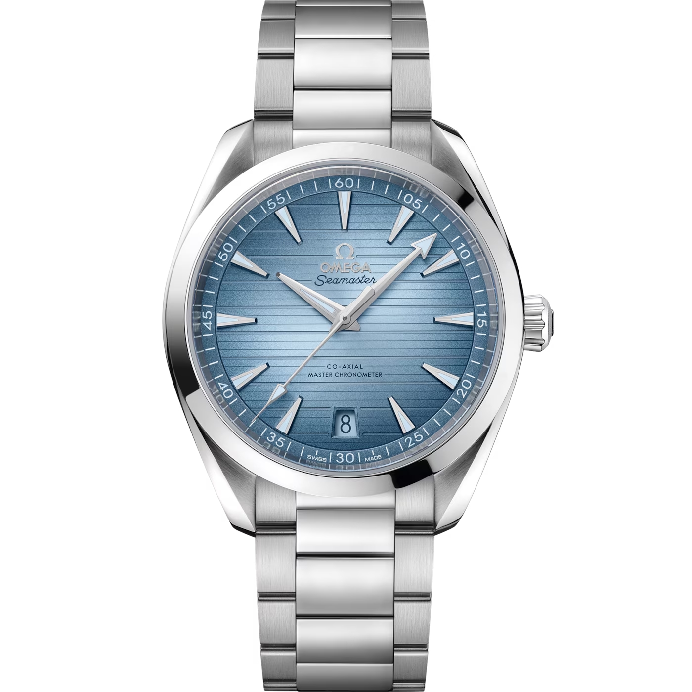 チークパターンがあしらわれたダイアルのカラーは、オメガ独自のSummer Blue。サンブラッシュ仕上げとPVD加工が施され、光沢のあるグラデーションが時計のもつ防水性のレベルを反映しています。ロジウム仕上げの針とインデックスには他にはないライトブルーのスーパールミノヴァが塗布され、6時位置の日付窓のブルーとマッチしています。