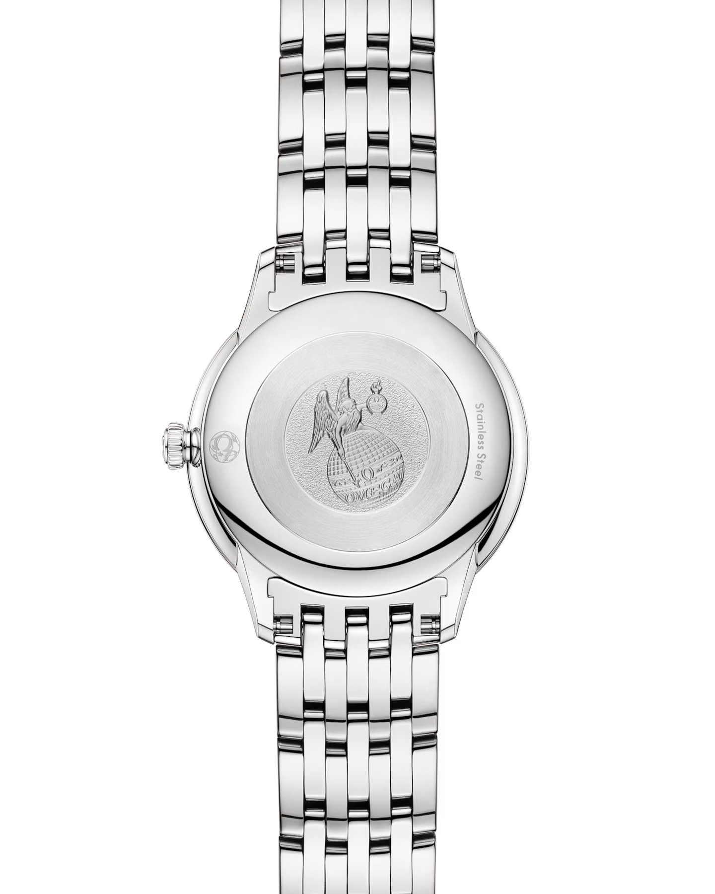 この直径27.5 mmのステンレススティール製モデルは、ホワイト マザーオブパールのダイアルを備えています。また、PVDセドナ™ゴールド カラーの針と、ローマ数字とカボションカットのインデックスが交互にセットされています。このタイムピースのシンプルな外観は、ケースバック全体にエンボス加工であしらわれた時の神クロノスのメダリオンによって引き立てられています。