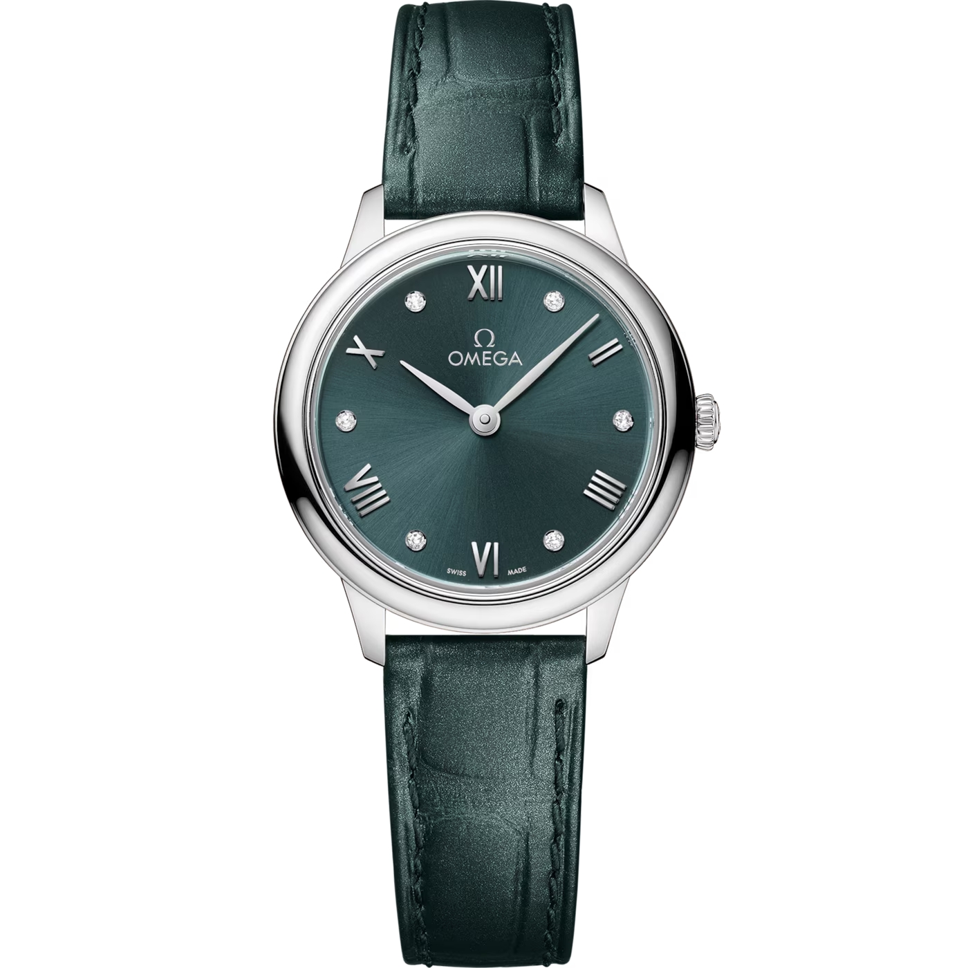 この直径27.5 mmのステンレススティール製モデルは、サンブラッシュ仕上げのPVDダークブルーグリーンのダイアルを備えています。また、ロジウム仕上げの針と、ローマ数字とダイヤモンドのインデックスが交互にセットされています。このタイムピースのシンプルな外観は、ケースバック全体にエンボス加工であしらわれた時の神クロノスのメダリオンによって引き立てられています。