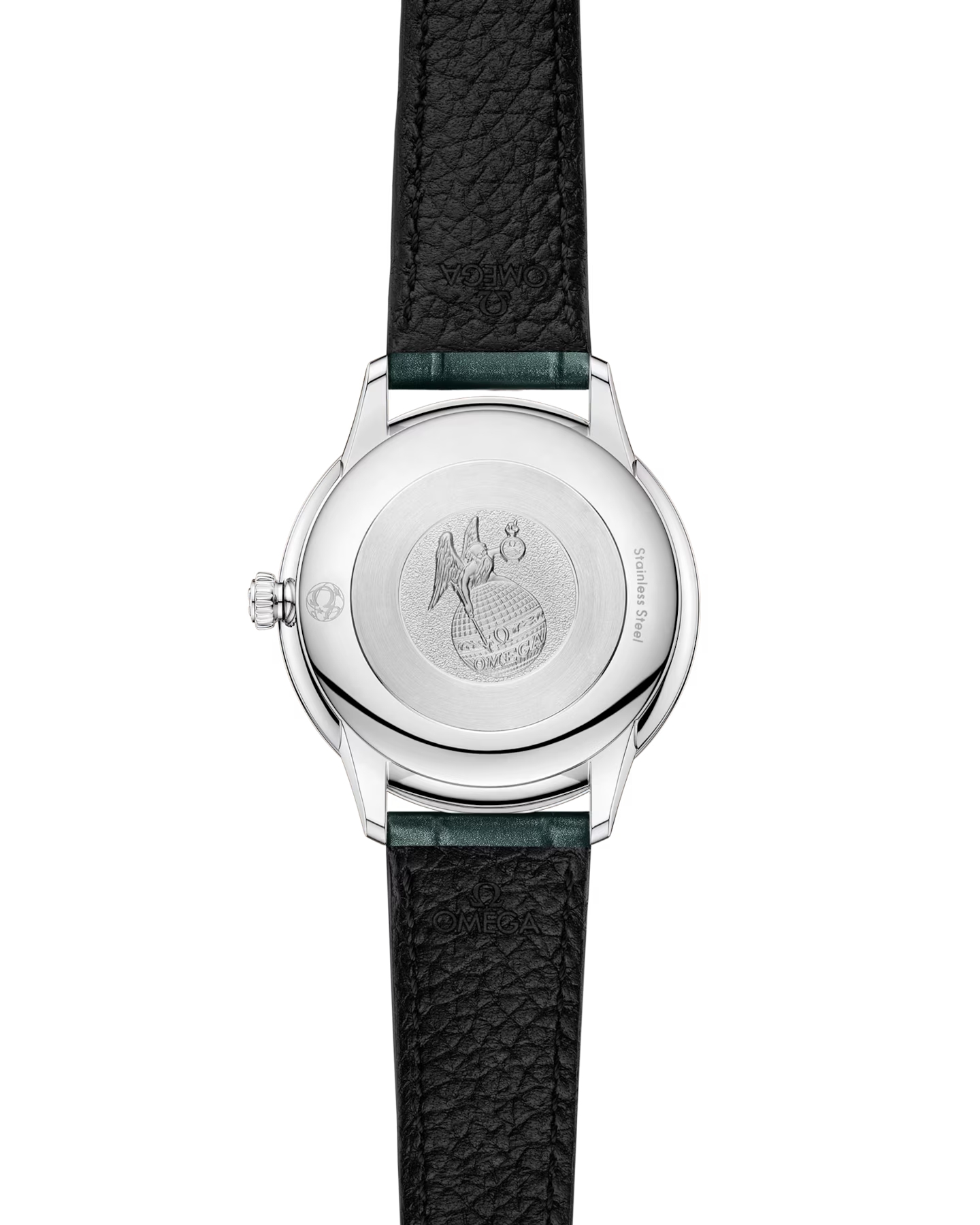 この時計には、きらめくダークブルーグリーンのレザーストラップが付属しており、最低でも48か月の電池寿命を備えたオメガ クォーツキャリバー4061によって駆動しています。