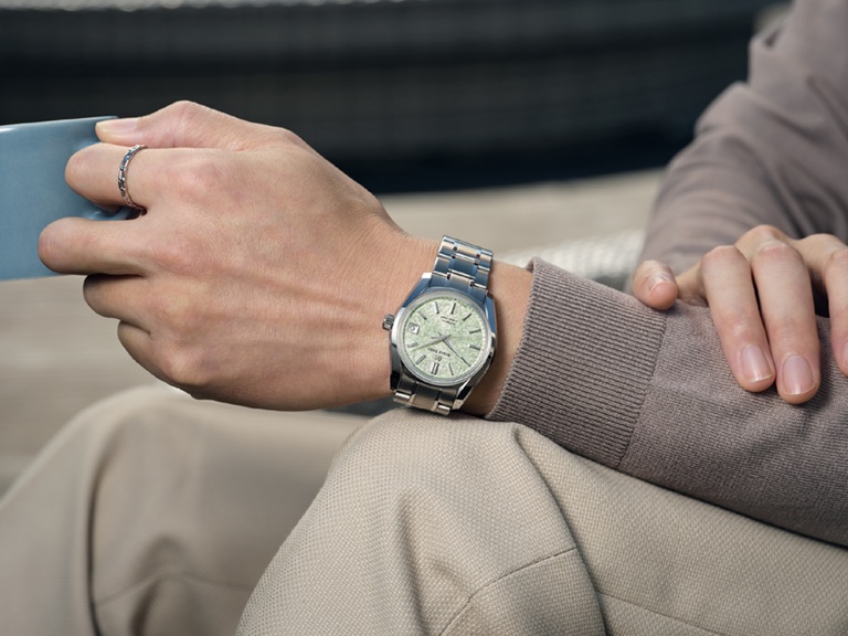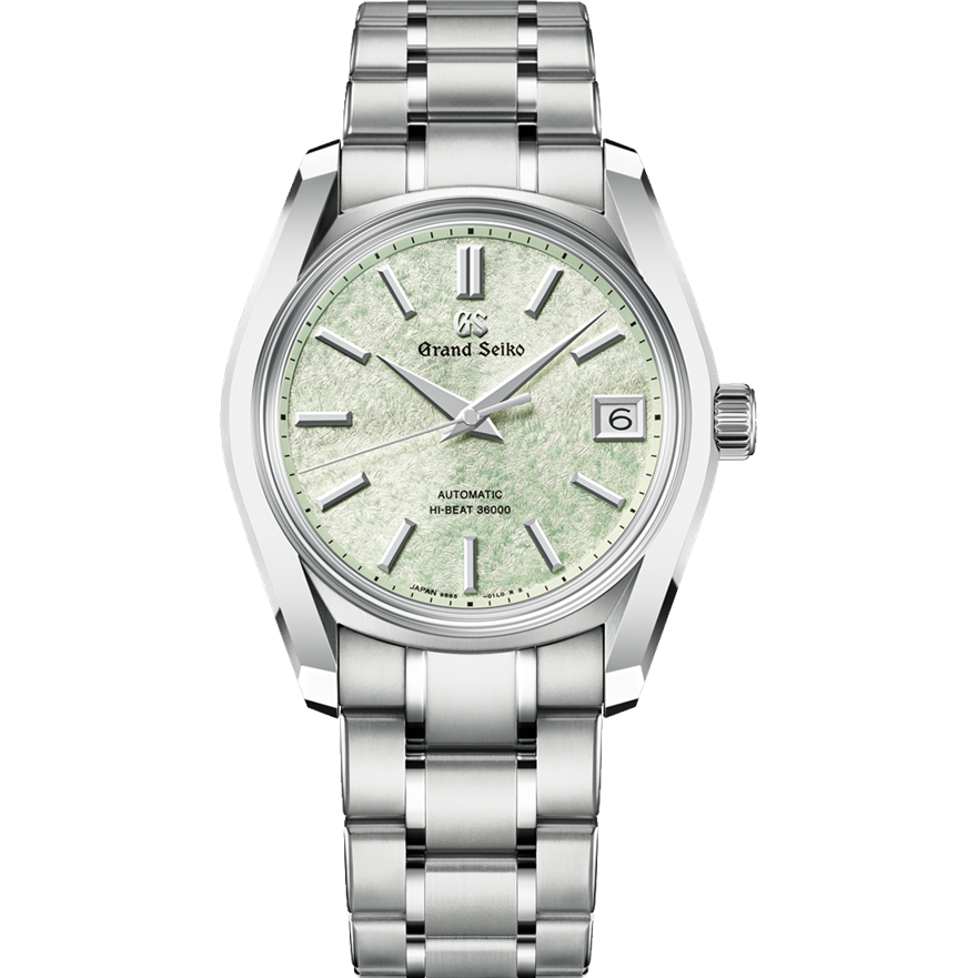 現代に至るまで継承されているブランド哲学「実用性の進化」を体現した傑作モデルとして名高いグランドセイコー初の自動巻メカニカルモデル「62GS」を、現代的解釈によってアレンジしたモデルです。ライトグリーンのダイヤルは、二十四節気の一つである春の「清明」の頃に芽吹く、桜の若葉をイメージ。薄桃色の桜の花びらの合間で陽の光を透かして光る若葉の瑞々しさを表現しました。ムーブメントには毎秒 10 振動のハイビートムーブメント「キャリバー9S85」を搭載し、精度のばらつきを抑え、より安定した高精度を実現。ケース径38mmのサイズ感に加え、ケースとブレスレットには通常のチタンよりも傷つきにくく、白く美しいブライトチタンを採用し、心地よい装着感を創出しました。