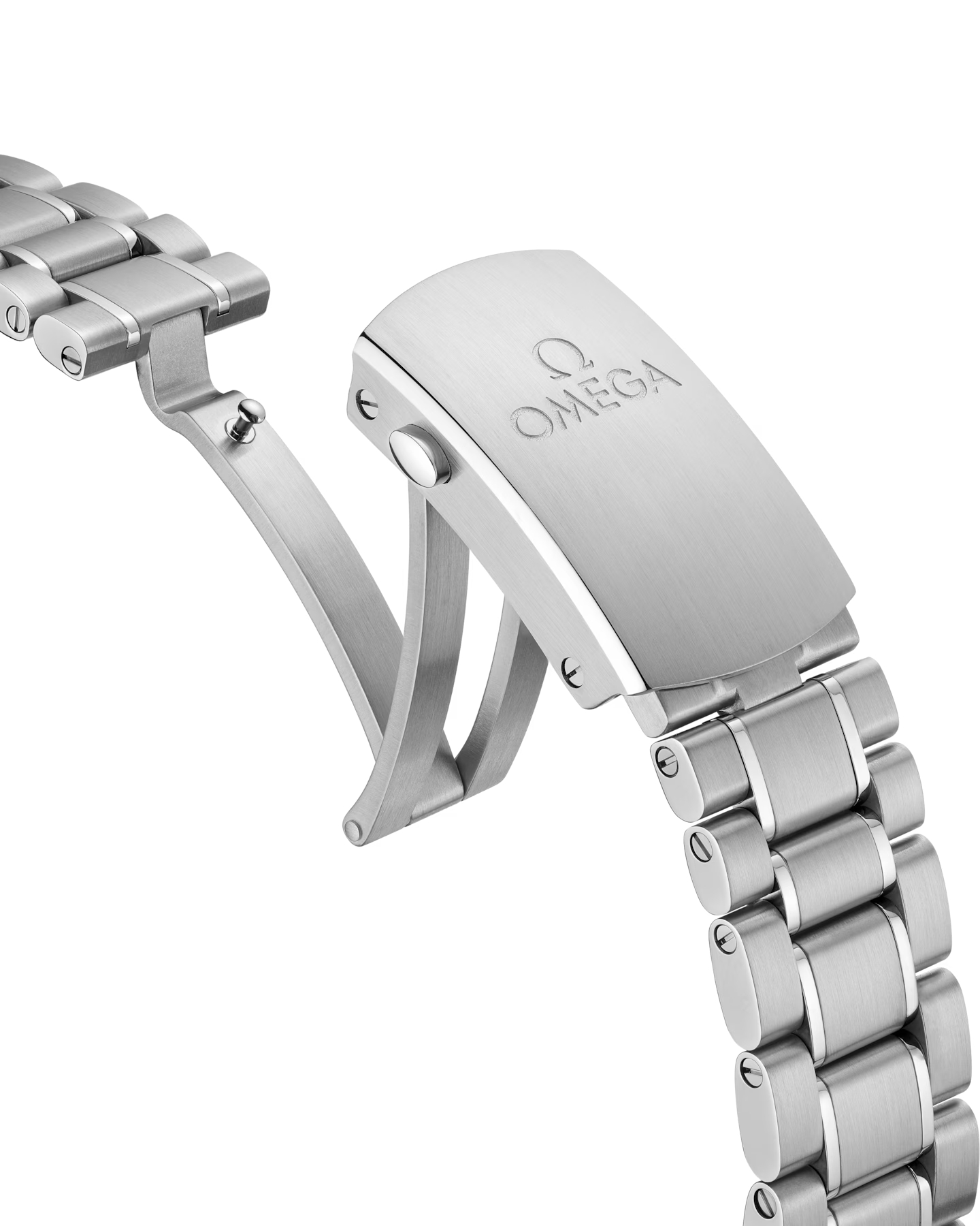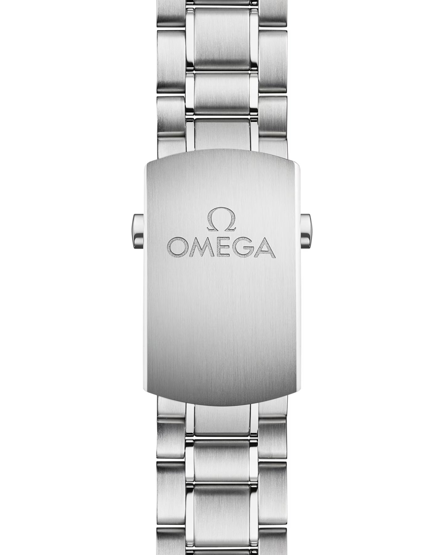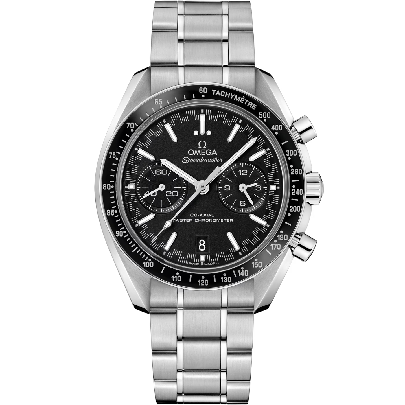 「スピードマスター レーシング マスター クロノメーター」のステンレススティール製の44.25mmケースには、リキッドメタル®によるタキメータースケールを備えたブラックセラミック製のベゼルリングがセットされています。ブレスレットは、ステンレススティール製です。