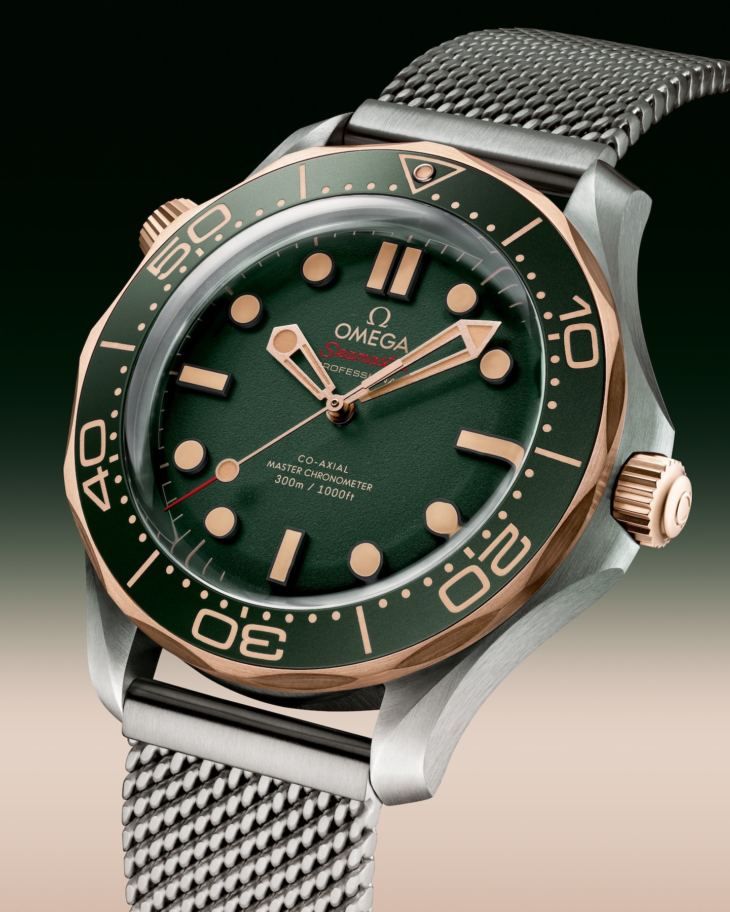 サンドブラスト加工のグリーンアルミニウムを使用したダイアルは、18KブロンズゴールドをPVDコーティングした針とブラックのインデックスを備え、そのすべてにヴィンテージスーパールミノヴァが施されています。オメガのロゴやその他のマーキングは、ライトブラウンとレッドの転写で施されています。