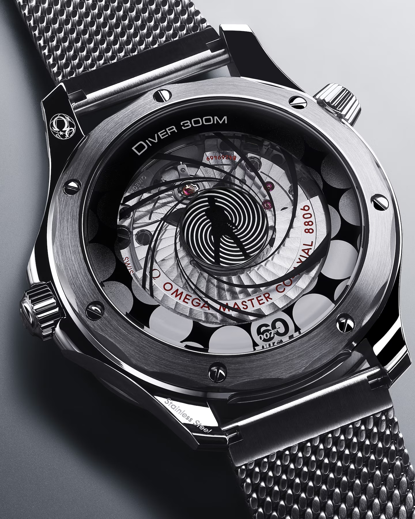 ケースバックのサファイアガラスには、微細構造の金属加工による装飾が施され、その下にボンドのシルエットと回転するガンバレルという、アイコニックな映画のオープニングシーンを見ることができます。モアレを生み出すアニメーションは、ロリポップスタイルの秒針の動きに連動しています。
